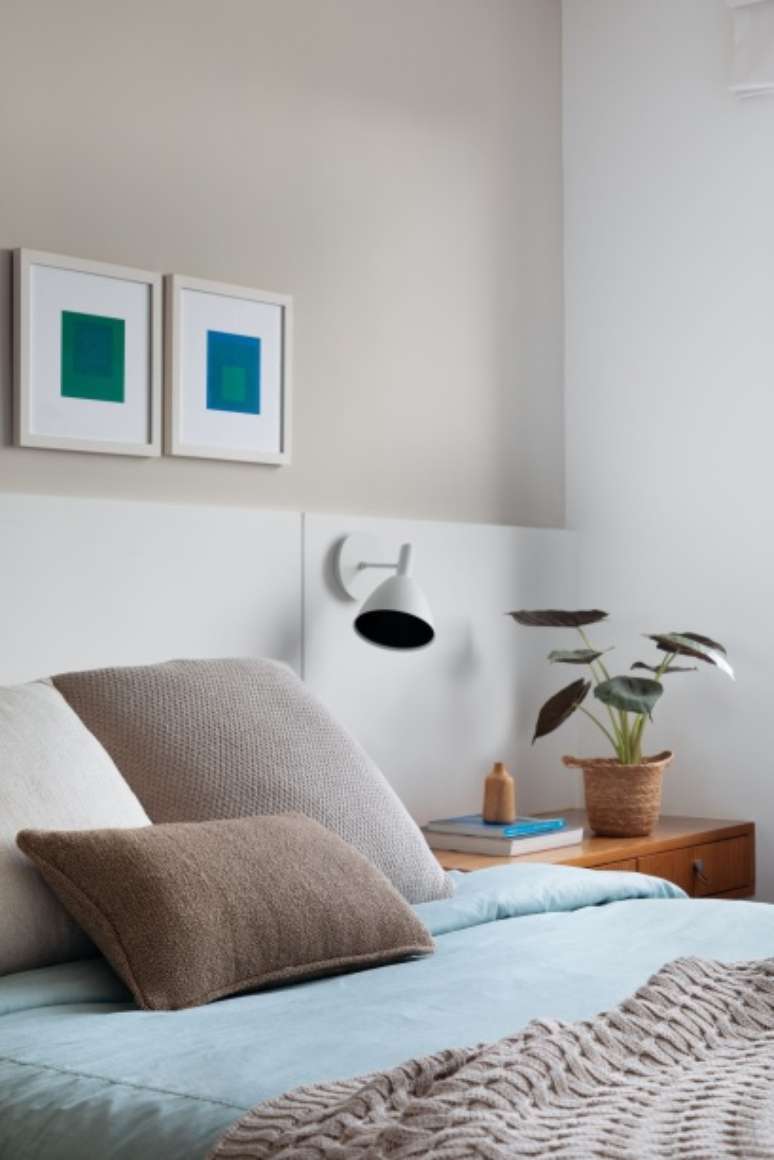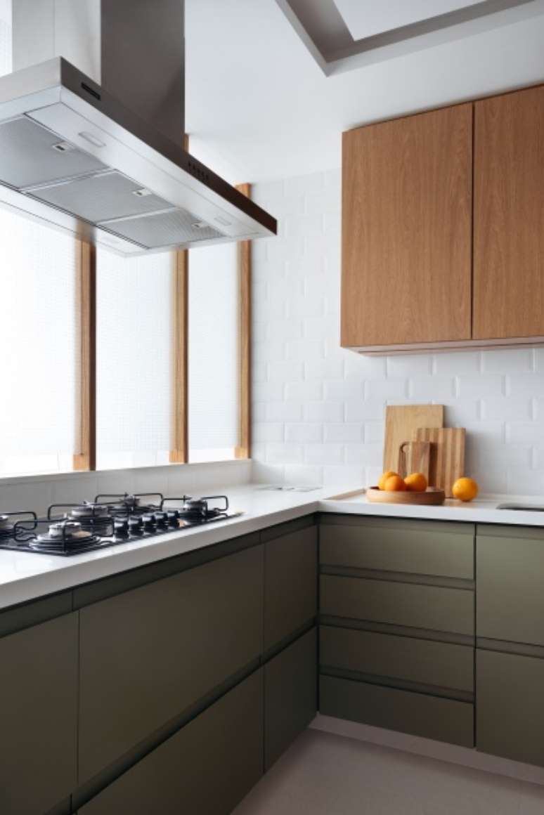 A cor foi usada apenas de forma pontual nas obras de arte, objetos e almofadas. Na cozinha, eles também escolheram revestimentos neutros: porcelanato off white no piso; cerâmica Metro White, com paginação mata junta, na parede; quartzo branco nas bancadas. Já a marcenaria ganhou revestimento melamínico, em dois padrões: verde bambu e freijó.