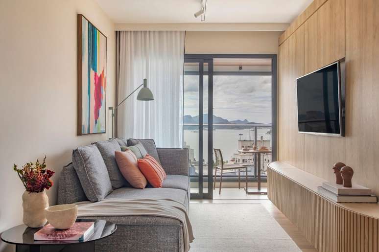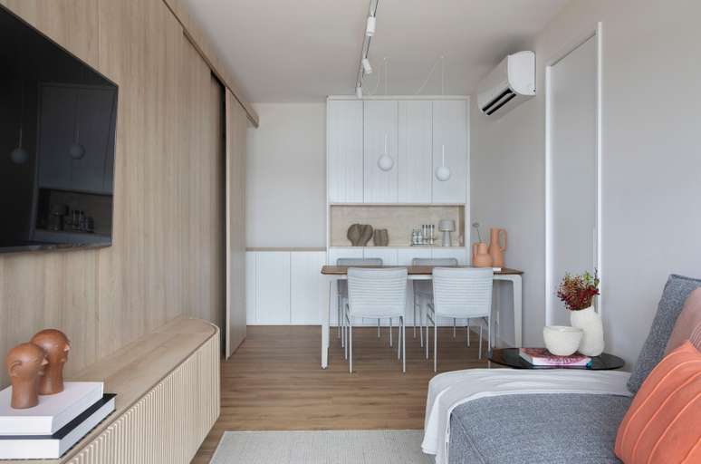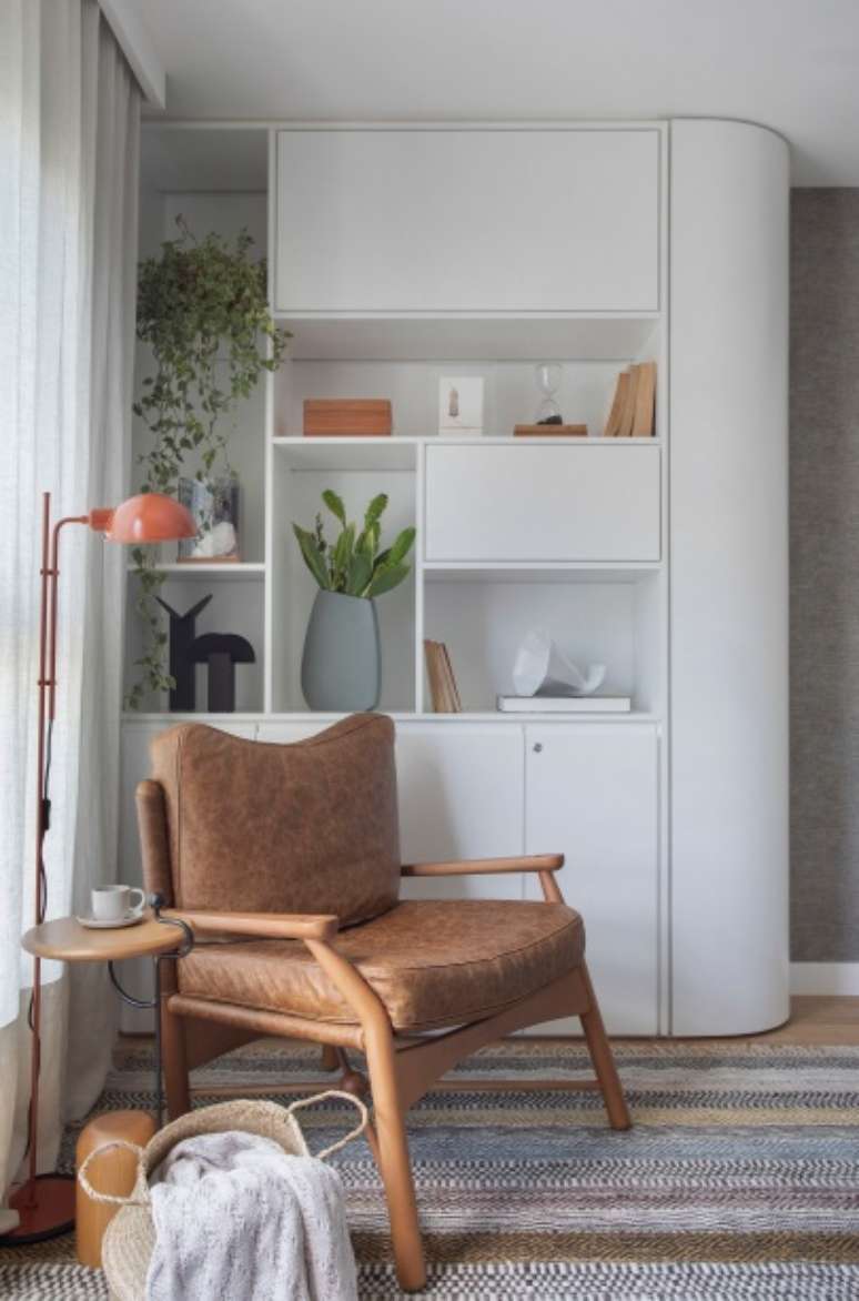 Materiais naturais e marcenaria com formas curvas marcam apê de 65m²
