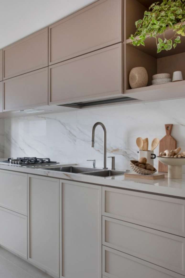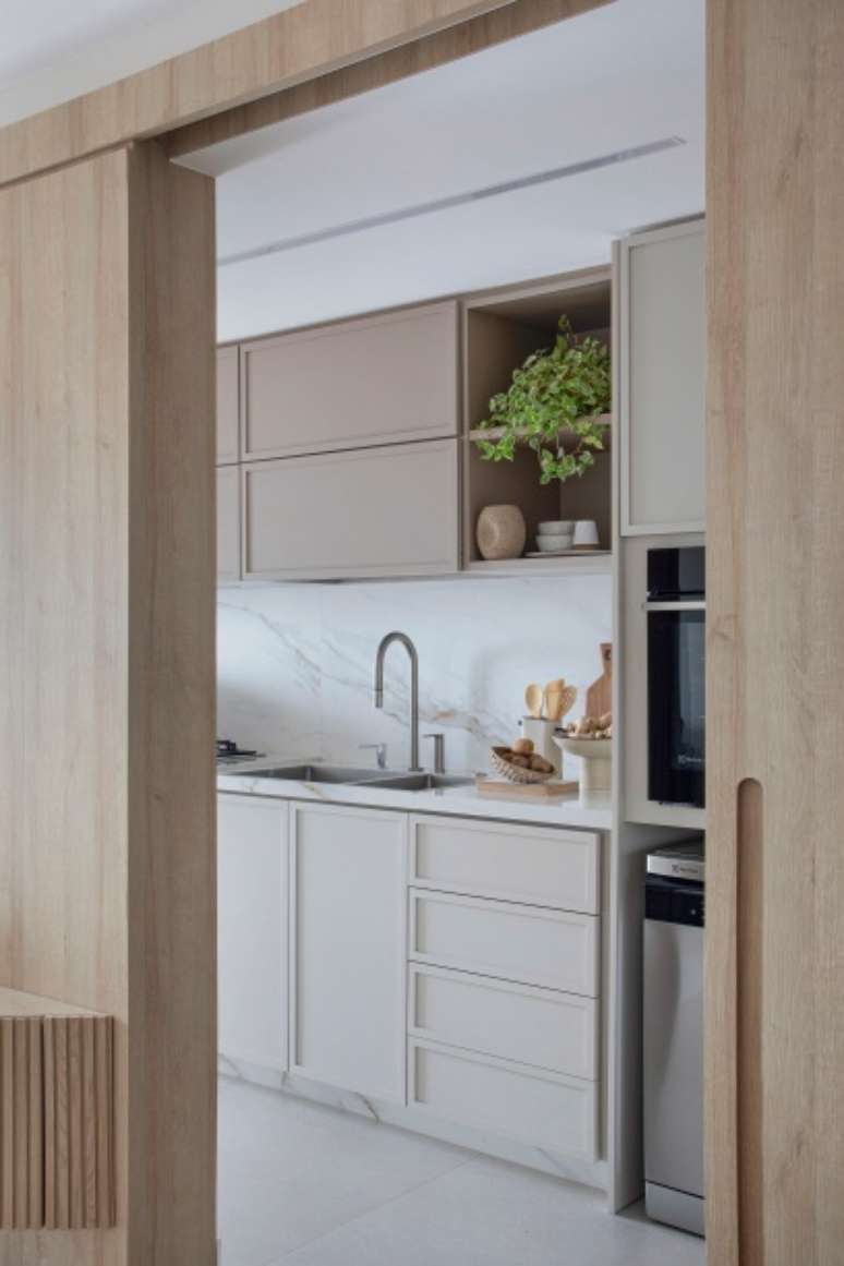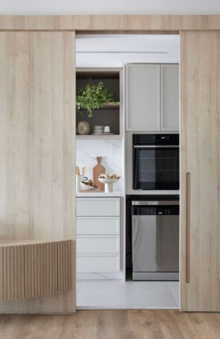 A cozinha ganhou acesso através de painel de correr e conta com uma marcenaria bem detalhada (Inovar Marcenaria), atendendo todas as necessidades do casal, com a criação de uma despensa, torre quente e armários superior e inferior com bastante espaço de armazenamento interno.