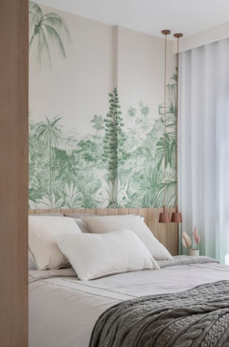 No quarto do casal rouba a cena o painel de parede Mata Atlântica Verde (da Branco Casa), com folhagens em tom de verde suave, em total sintonia com cortina de linho com degradê na mesma cor (da Cortinaria). Outro destaque é o guarda-roupa com portas de correr espelhadas do piso ao teto, que fez o ambiente parecer mais amplo e iluminado e ainda trouxe para dentro do dormitório a vista da Baía da Guanabara.