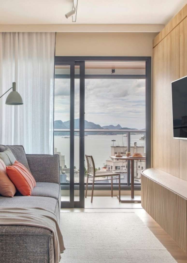 O projeto de interiores foi pensado para atender ao desejo dos clientes de levar uma vida mais leve, prática, desapegada e conectada com a natureza. Para isso, o arquiteto lançou mão de materiais naturais, formas curvas e orgânicas e tonalidades suaves, mantendo a vista da Baía da Guanabara como o grande protagonista do novo lar.