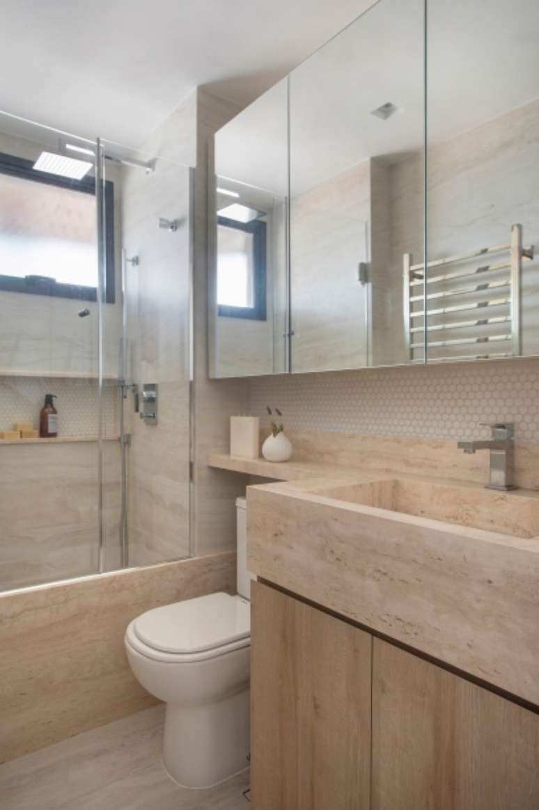 Entre as principais alterações na planta original, foi necessário eliminar o lavabo para criar uma cozinha maior para caber uma geladeira grande e uma pequena despensa. Com a perda do lavabo, o arquiteto transformou o banheiro da suíte, que seria usada como escritório, em banheiro social. "Fechamos a porta deste banheiro para o quarto e abrimos para o hall íntimo", detalha Ravaglia. Toda a obra foi executada pela construtora Tektos (@construtoratektos).