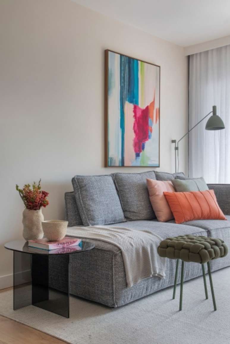 Já a marcenaria ripada (executada pela Inovar) do hall de entrada se estende até a área do jantar e ganhou acabamento em laca branca, além de um nicho em travertino romano levigado. As cores mais vibrantes são pontuais e aparecem, sobretudo, nas almofadas do sofá e no quadro Abstract J1, criação da artista Juliana Scheuer para a Urban Arts.