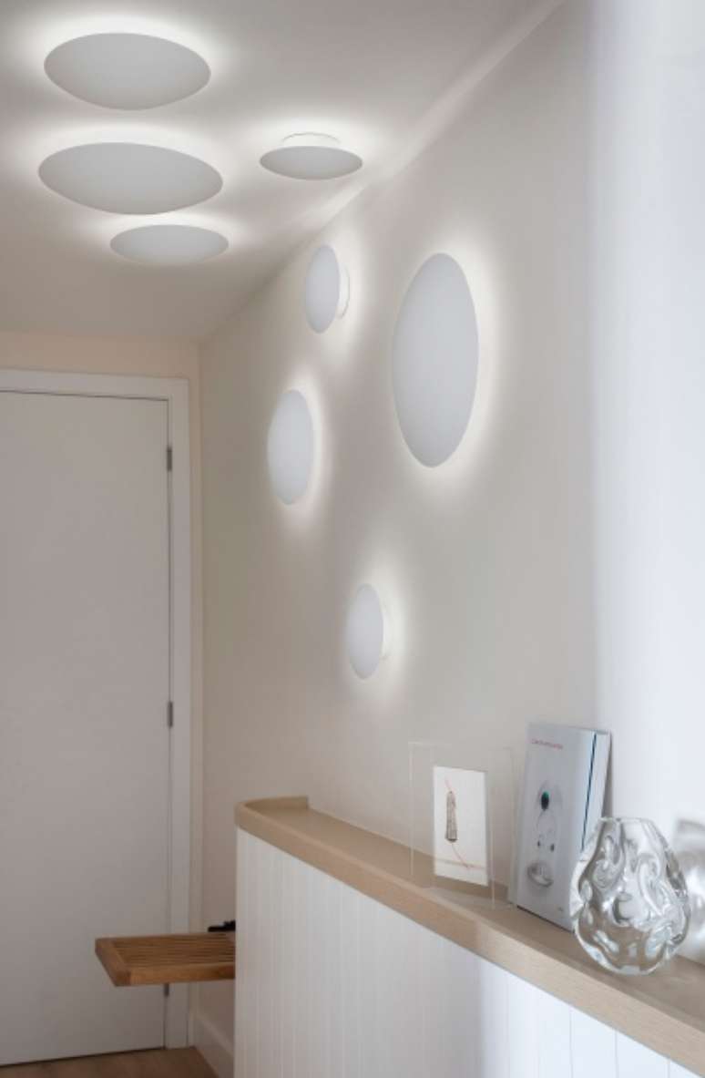 Um dos destaques do projeto é, sem dúvida, o hall de entrada. Para este pequeno corredor com pouca luz natural, o arquiteto criou uma composição de oito luminárias brancas de formato esférico, em diferentes tamanhos, que parecem subir a parede e invadir o teto. O espaço conta ainda com um banco de apoio engastado na parede para que os moradores usem de apoio na hora de se calçarem, além de um armário estreito até meia altura, que serve, ao mesmo tempo, de sapateira e aparador.