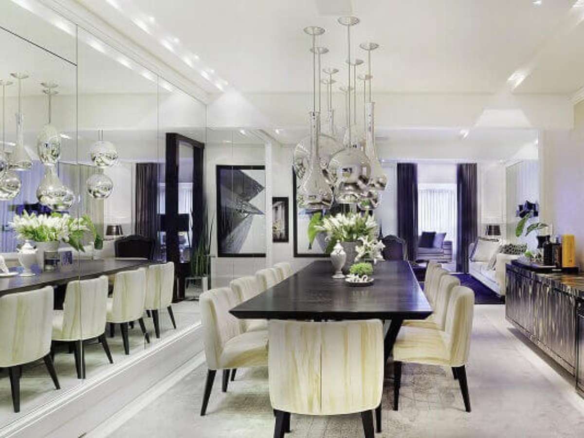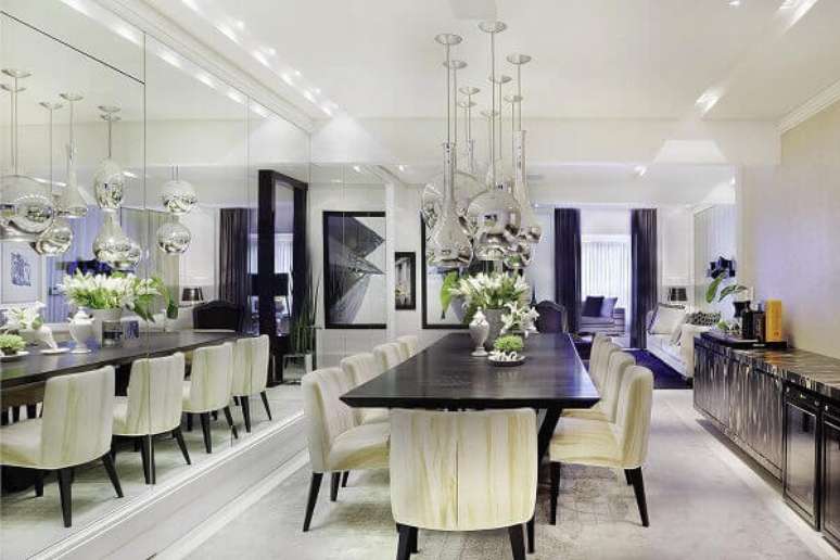 36- Mesa para sala de jantar retangular encostada em parede espelhada. Projeto: Glória Copello