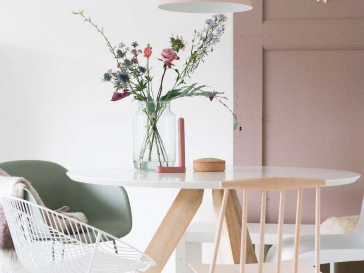 56. Sala de jantar com mesa retrô e cadeiras rosa claro – Foto Etsy