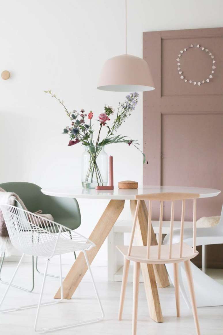 50. Sala de jantar com mesa retrô e cadeiras em tons pasteis – Foto Pufik