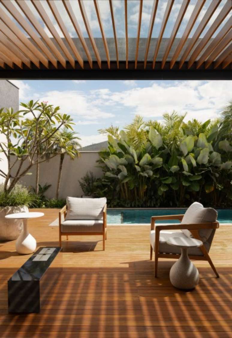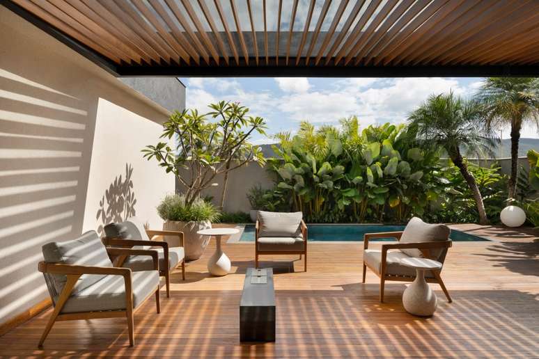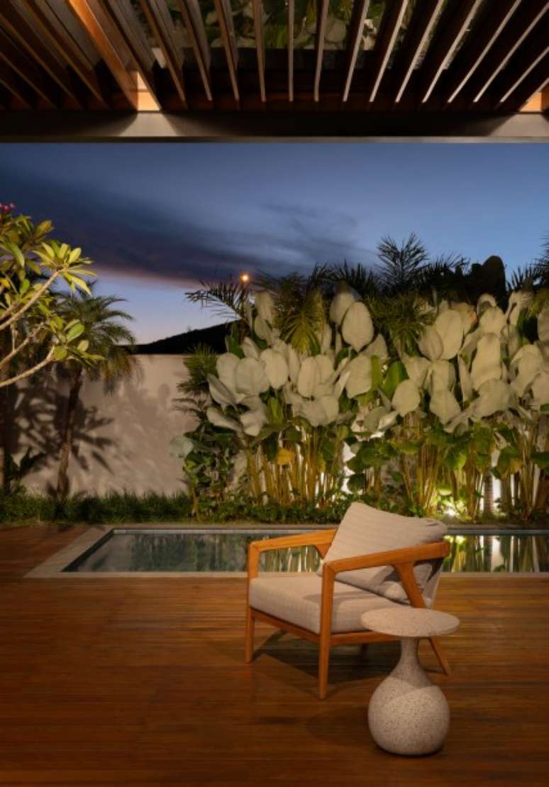 O escritório Piacesi Arquitetura assina o projeto de interiores e também o paisagismo da área externa, que conta com jardim e piscina