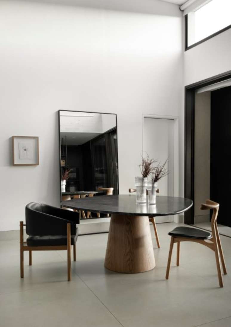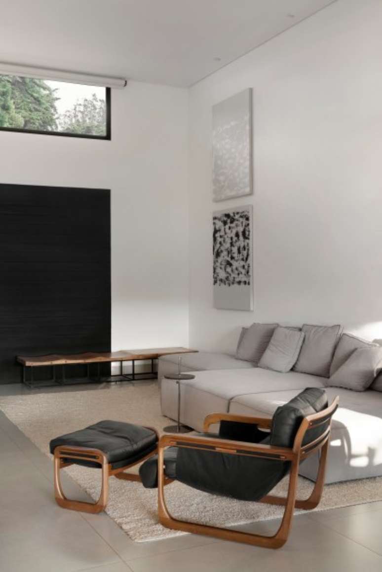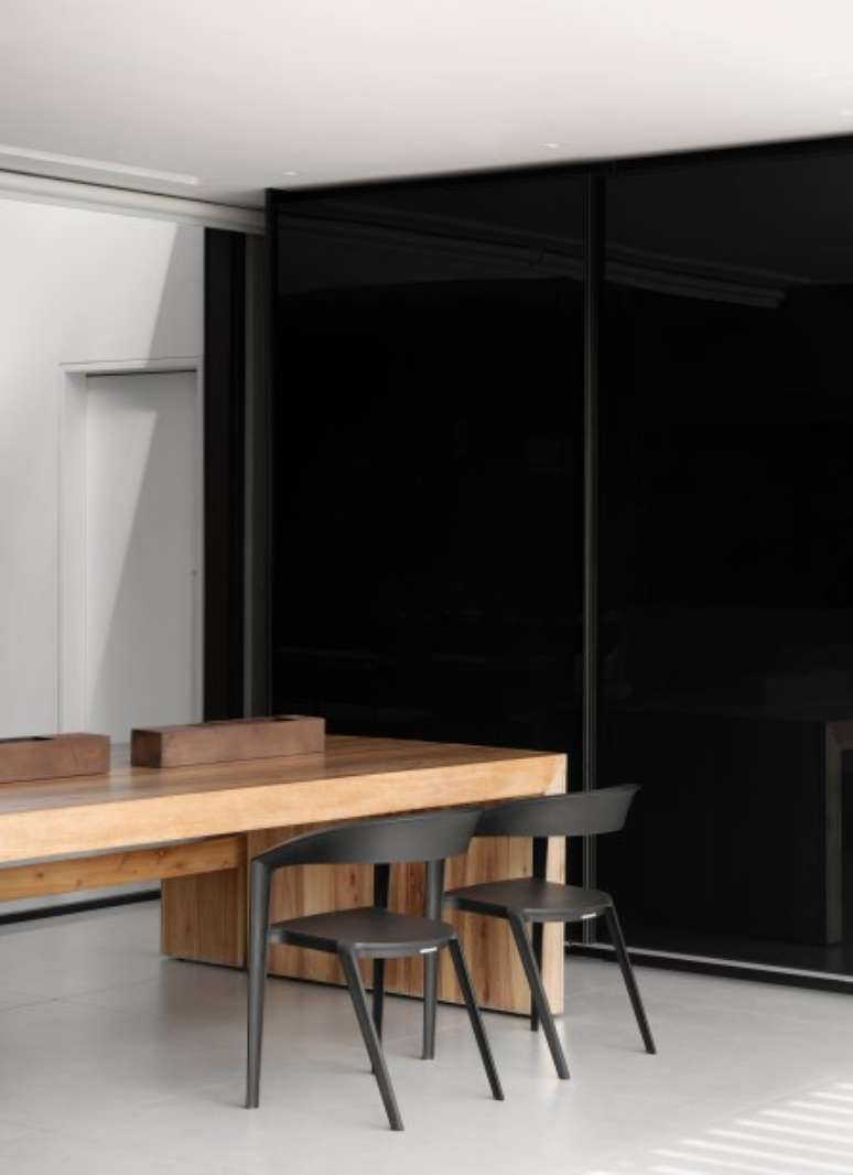 No quesito " paleta de cores", os ambientes internos tem como base uma combinação de preto, branco, cinza e elementos em madeira.