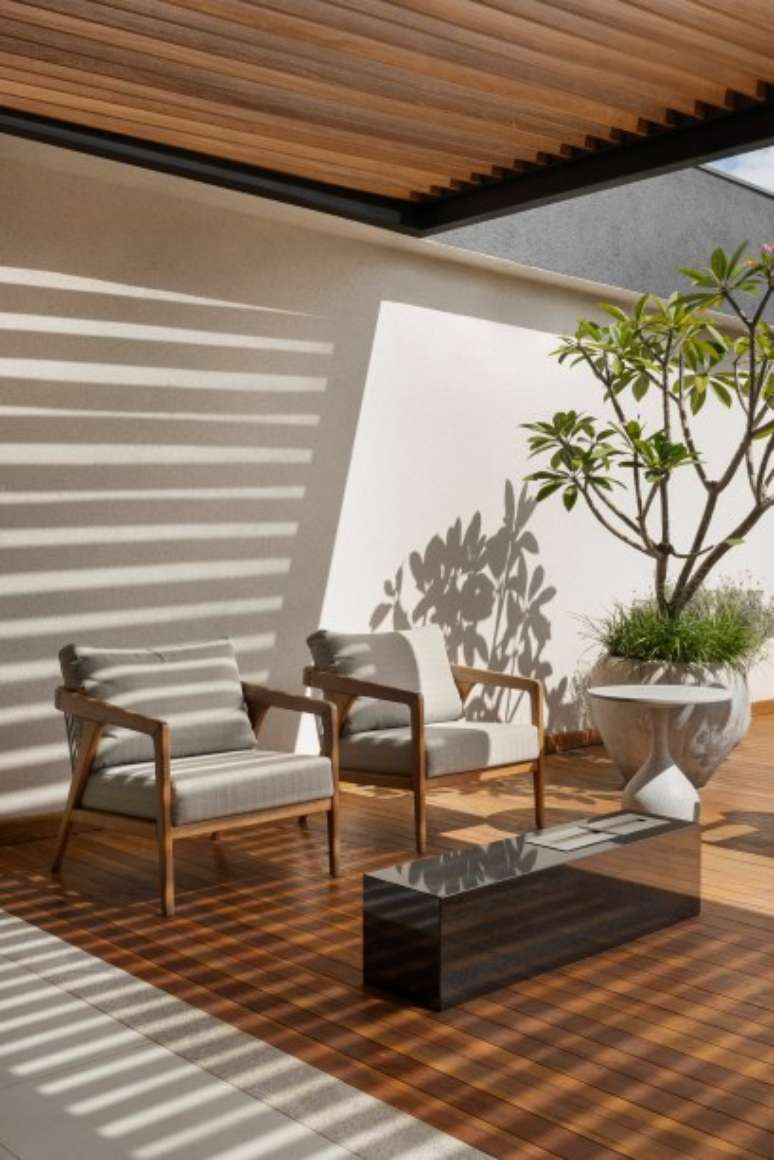 Segundo o arquiteto, no geral, o projeto buscou uma linguagem contemporânea e minimalista, e apostou em peças de design autoral pautadas, acima de tudo, pelo conforto. Com exceção das camas e um dos sofás da sala, que vieram do endereço antigo, todos os móveis da decoração são novos, tanto indoor como outdoor.