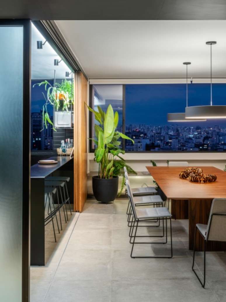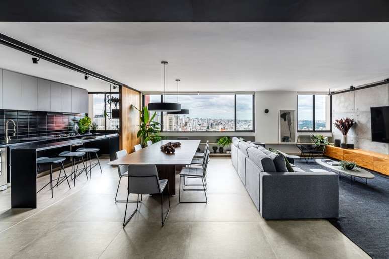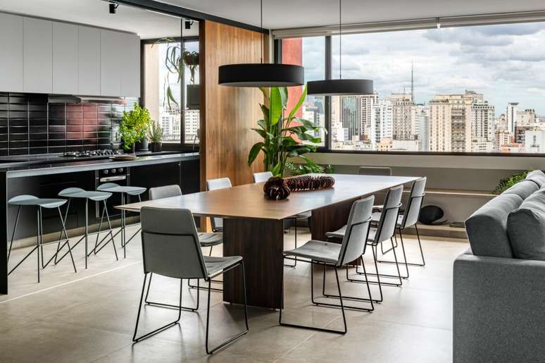 O projeto, assinado pelo escritório Macro Arquitetos, integrou os ambientes para aproveitar ao máximo a vista, a iluminação natural e a ventilação