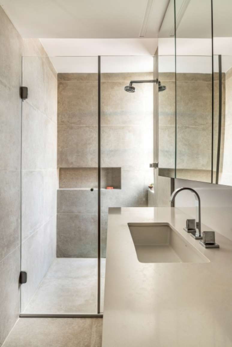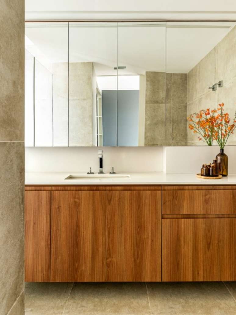 Para os banheiros, estende-se a associação de madeira feijó ao cimento queimado. O projeto luminotécnico de todo o apartamento focou em deixar o teto o mais limpo possível, usando pontos focais e opções de iluminação indireta por meio de automação e lâmpadas dimerizáveis.