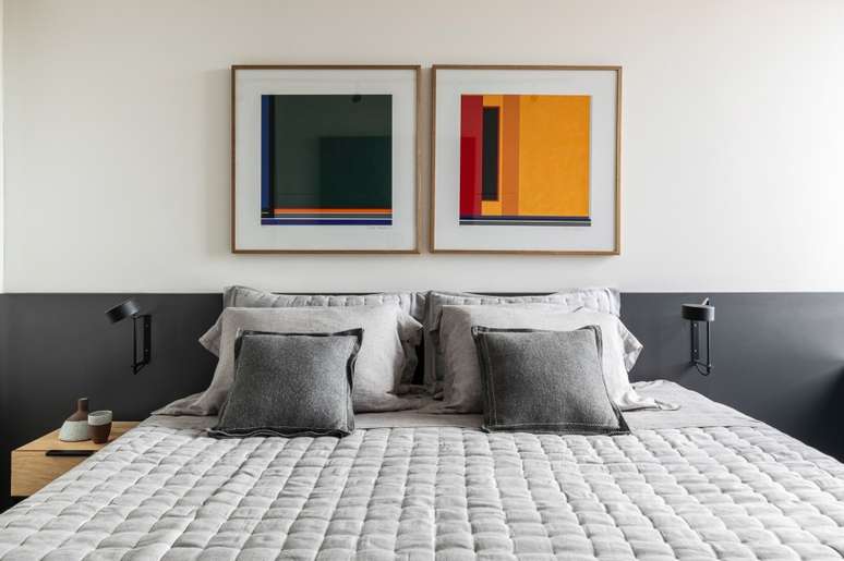 A suíte principal esconde um pequeno closet atrás do espelho. Na cabeceira, os quadros de Julia Rosolén trazem contraste aos tons de cinza. Como opção de luz indireta, dois direcionáveis finalizam o ambiente de descanso. A bancada do escritório em frente a janela com vedação acústica, proporciona um espaço de apoio para home office.