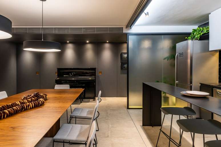 A cozinha integrada pode ser isolada por meio de um painel de madeira freijó. Quando aberto, o balcão preto de 8mm separa os ambientes discretamente, servindo como bancada de apoio para cozinha ou refeições intimistas.