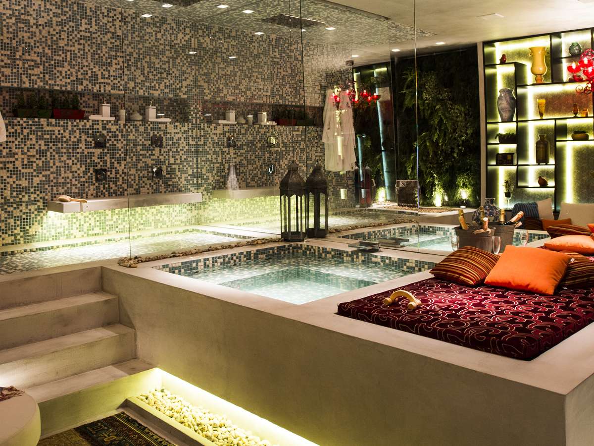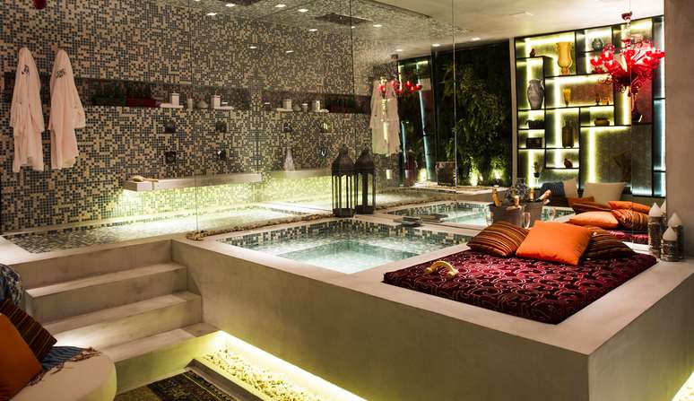 Villa Deca, de Guilherme Torres: chuveiro tem queda no mármore e há também sauna com estilo human turco banho a vapor, com jatos para massagem e espaço para relaxar