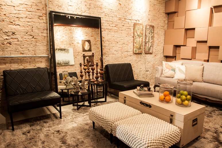 Elementos rústicos se unem a produtos modernos no projeto da sala de estar corporativa de Fábio Guedes e Lilian Bolognini