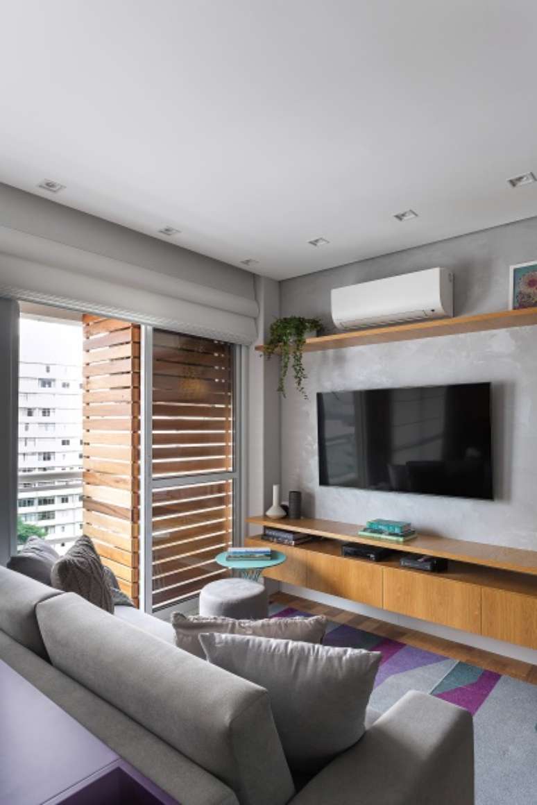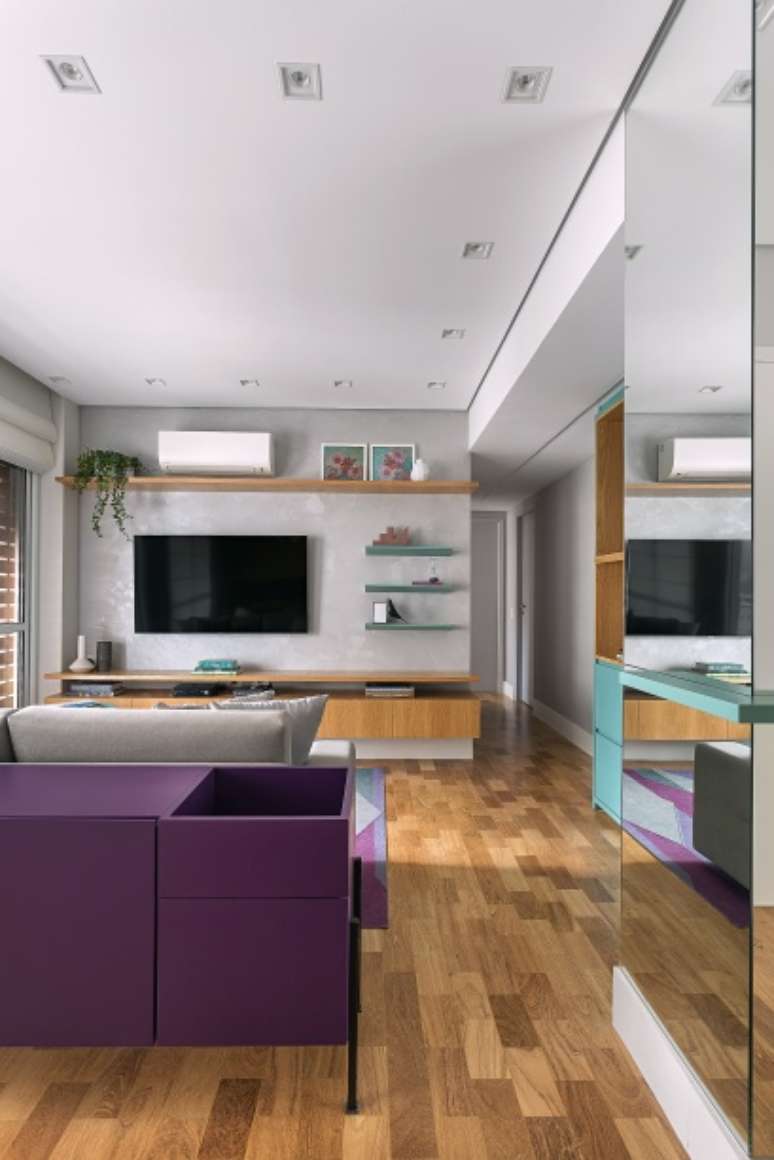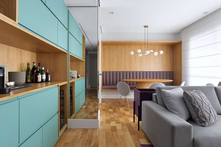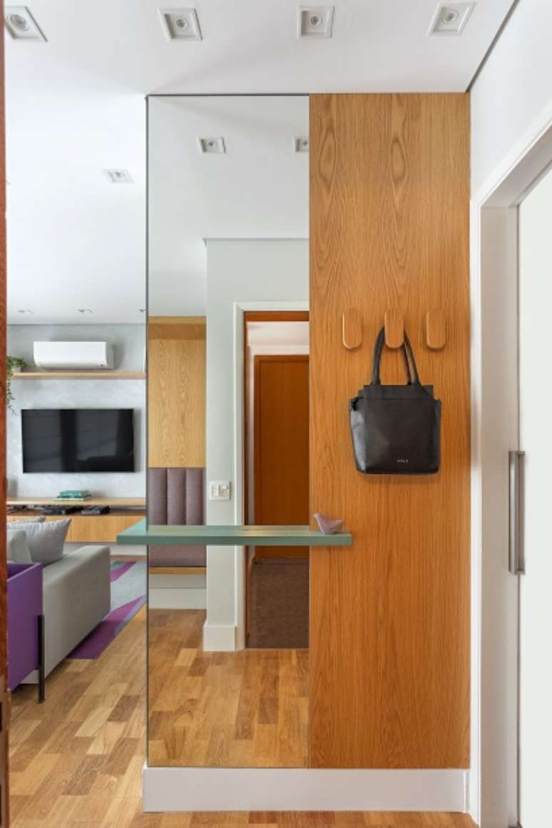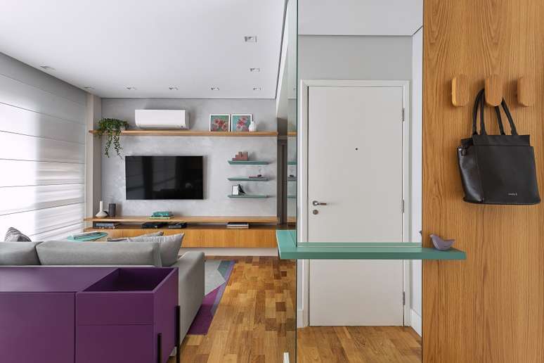 Para a sala, a arquiteta apostou na madeira como elemento de destaque, presente no piso e nos móveis feito sob medida. Um banco caixa, que parece flutuar na parede, chama atenção de quem chega.