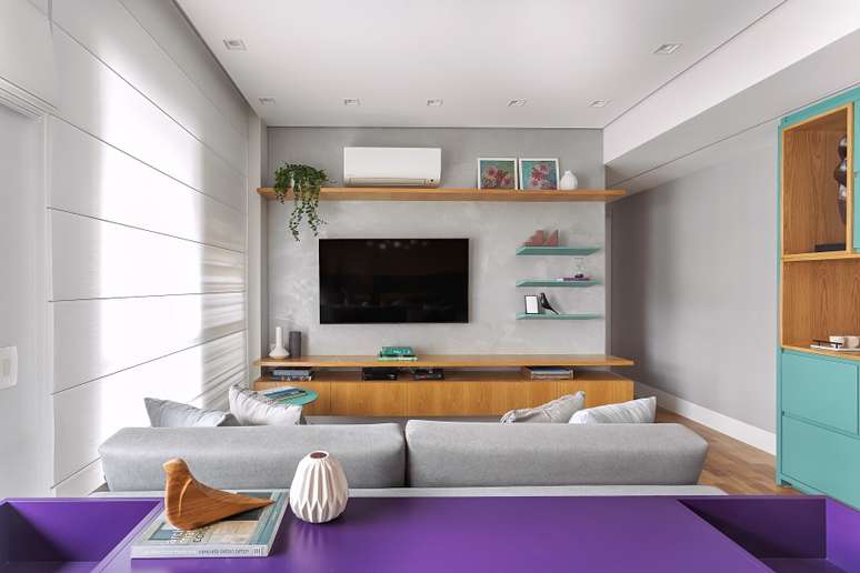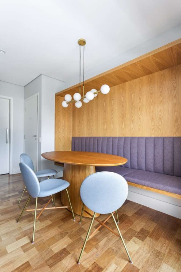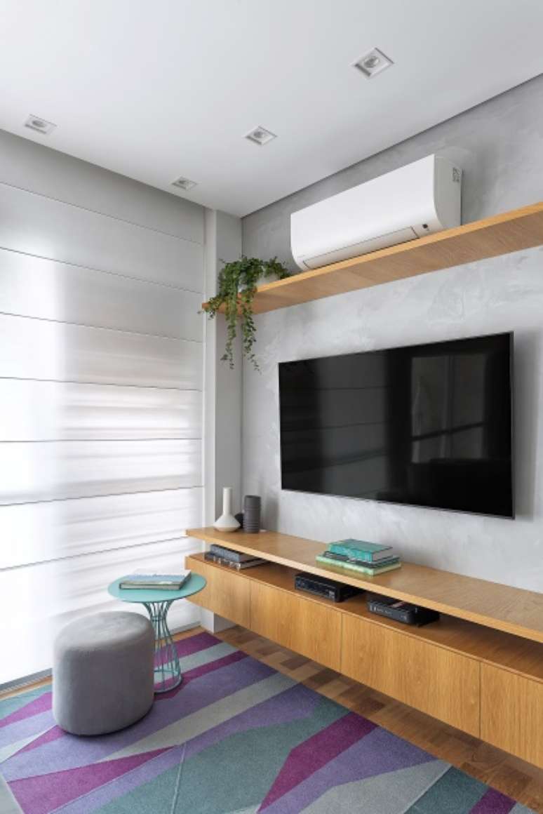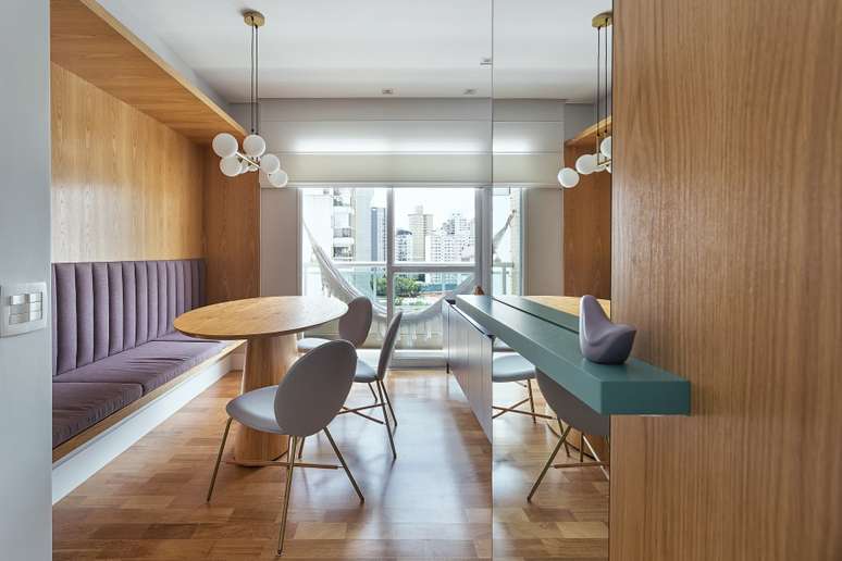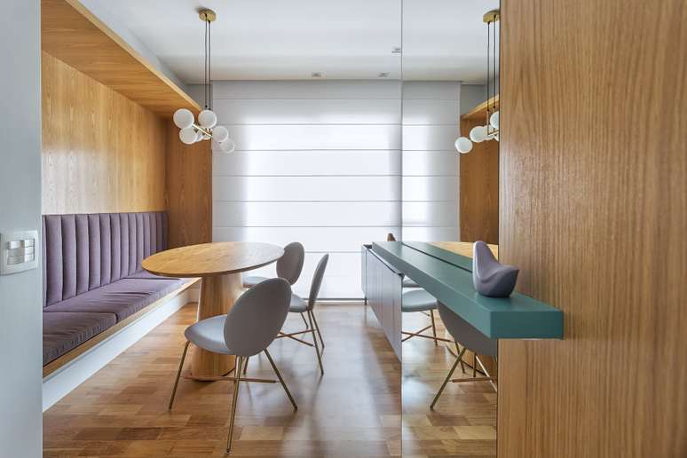 Para a sala, a arquiteta apostou na madeira como elemento de destaque, presente no piso e nos móveis feito sob medida. Um banco caixa, que parece flutuar na parede, chama atenção de quem chega.