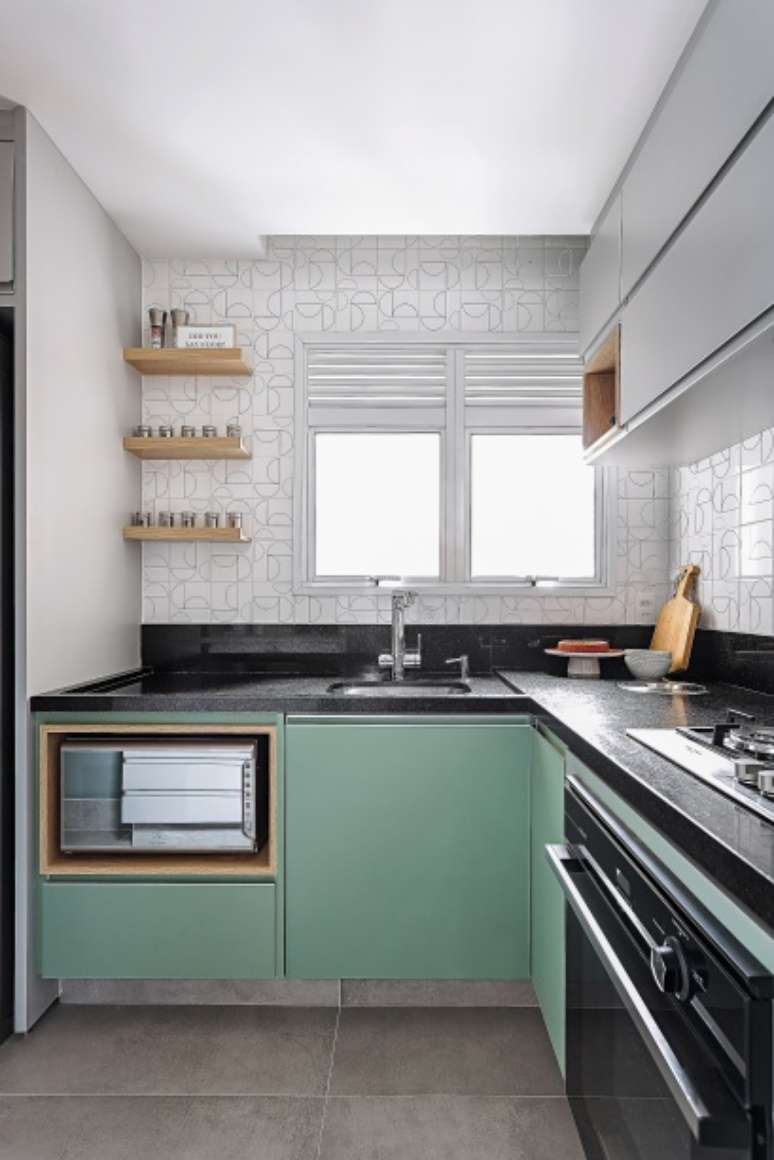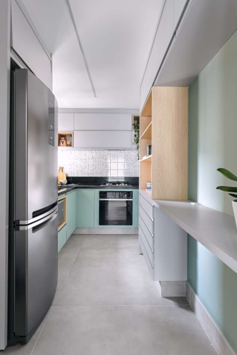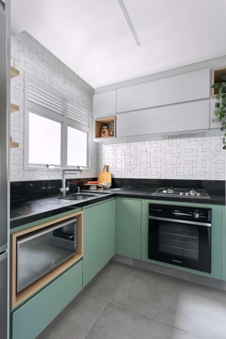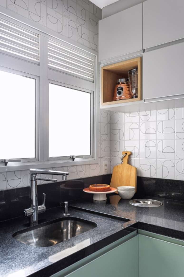 A cozinha ganhou móveis mais funcionais e atuais, além de um azulejo estampado que dá um toque moderninho ao espaço.