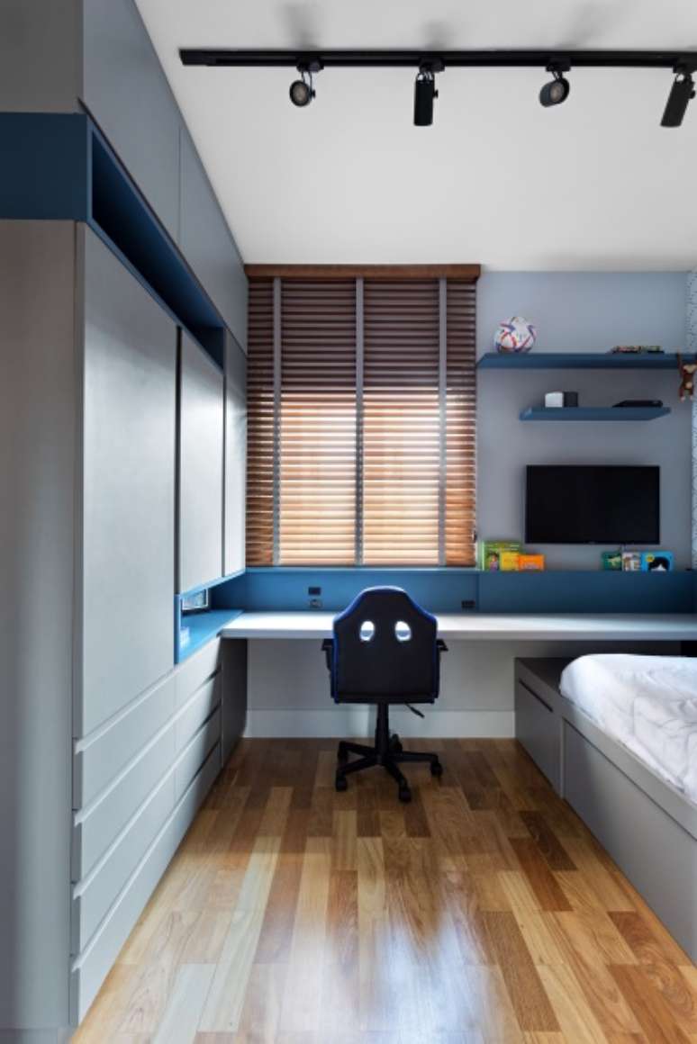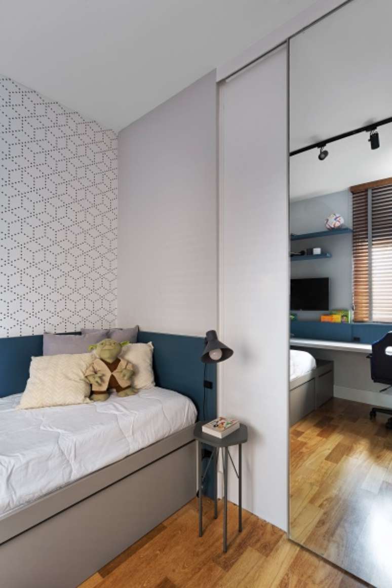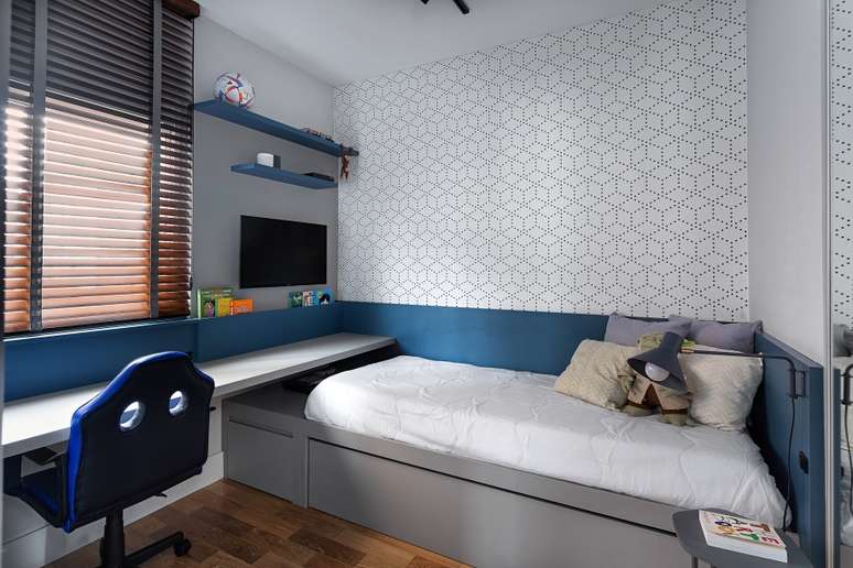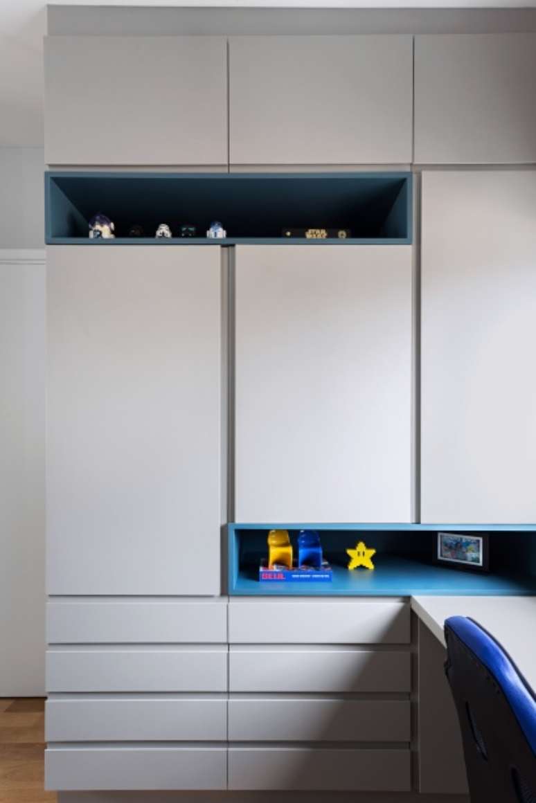 O quarto do pré-adolescente também ganhou reforma completa com marcenaria planejada e escolhas certeiras para o jovem, como o canto de estudos e a bicama para acomodar os amigos durante as festas de pijama.