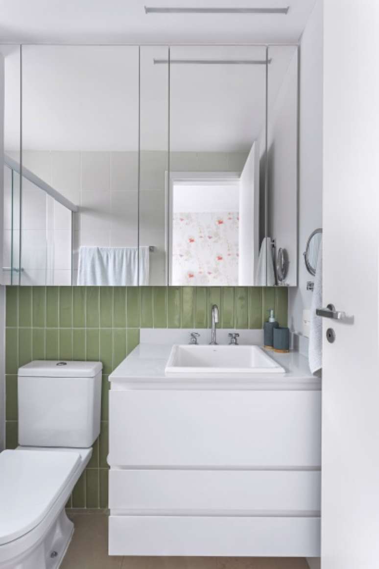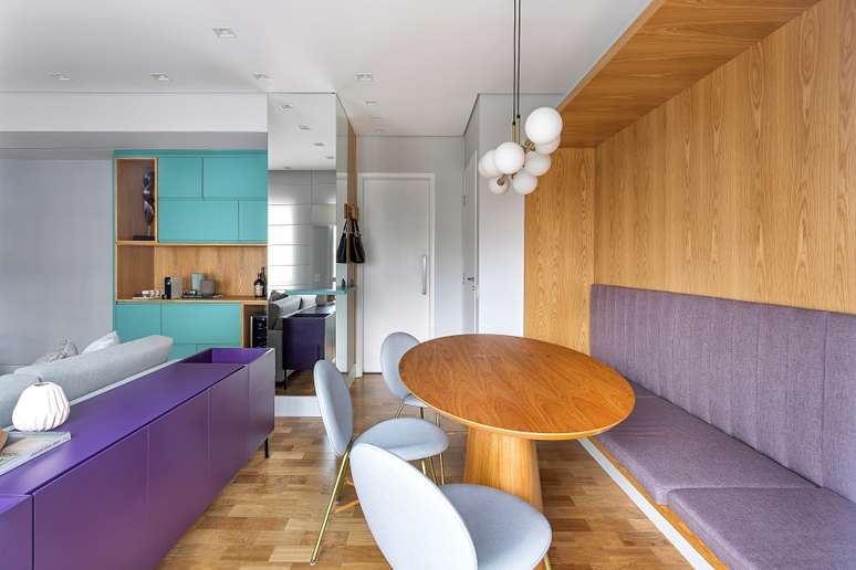 No entanto, Adriana utilizou o verde e trocou o lilás por um roxo, valorizando o espaço e trazendo personalidade. "O verde permeou para a cozinha e um dos banheiros. E para o quarto do filho pré-adolescente e no banheiro social focamos no azul", conta.