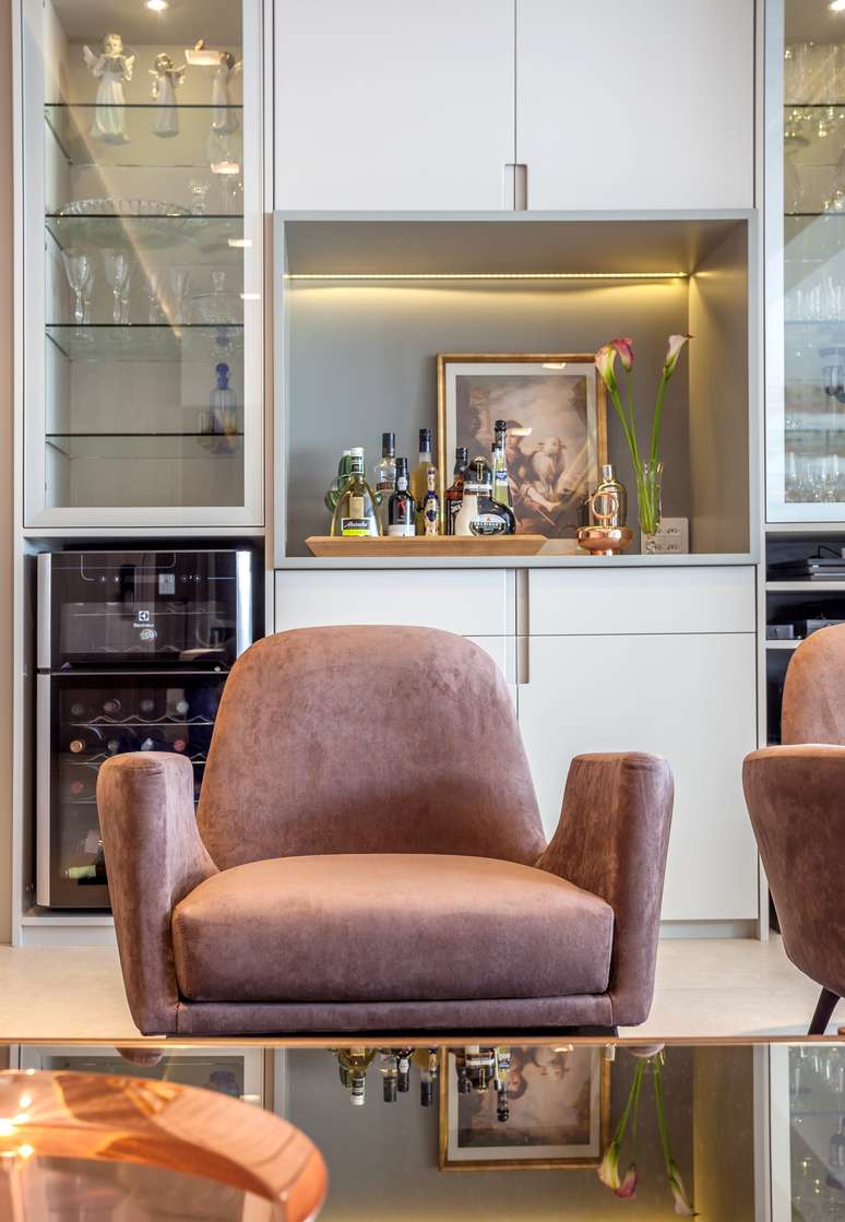 O nicho embutido, usado no living acima, é uma tendência nos projetos de decoração e a profissional destaca dois benefícios: a otimização do espaço e o ganho visual. "Mesmo que seja uma ilusão, o nicho embutido aparenta economizar espaço, o que é percebido como uma vantagem pelo cérebro", realça.
