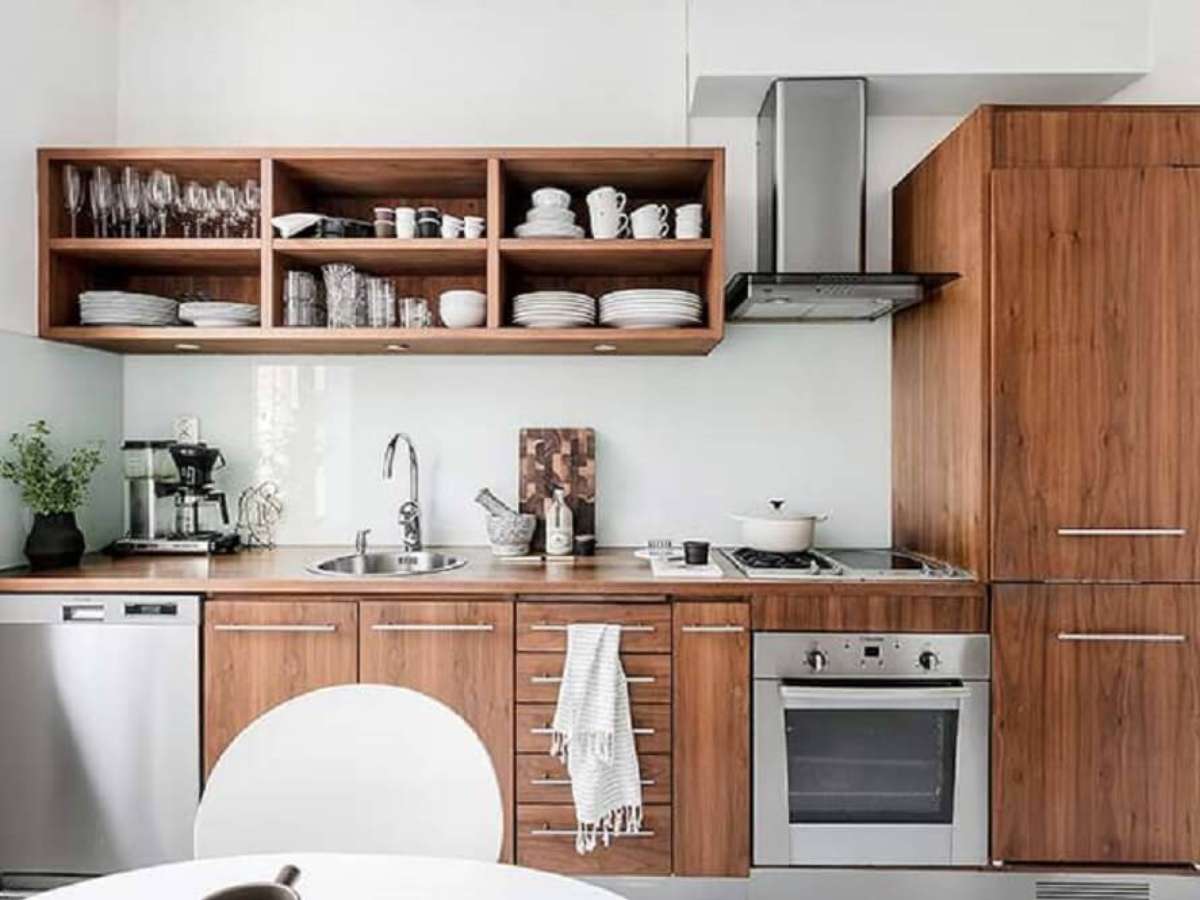 18. Cozinha compacta decorada com nichos para cozinha pequena em tons de madeira