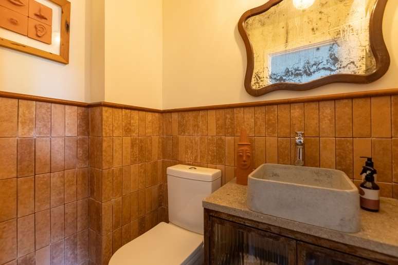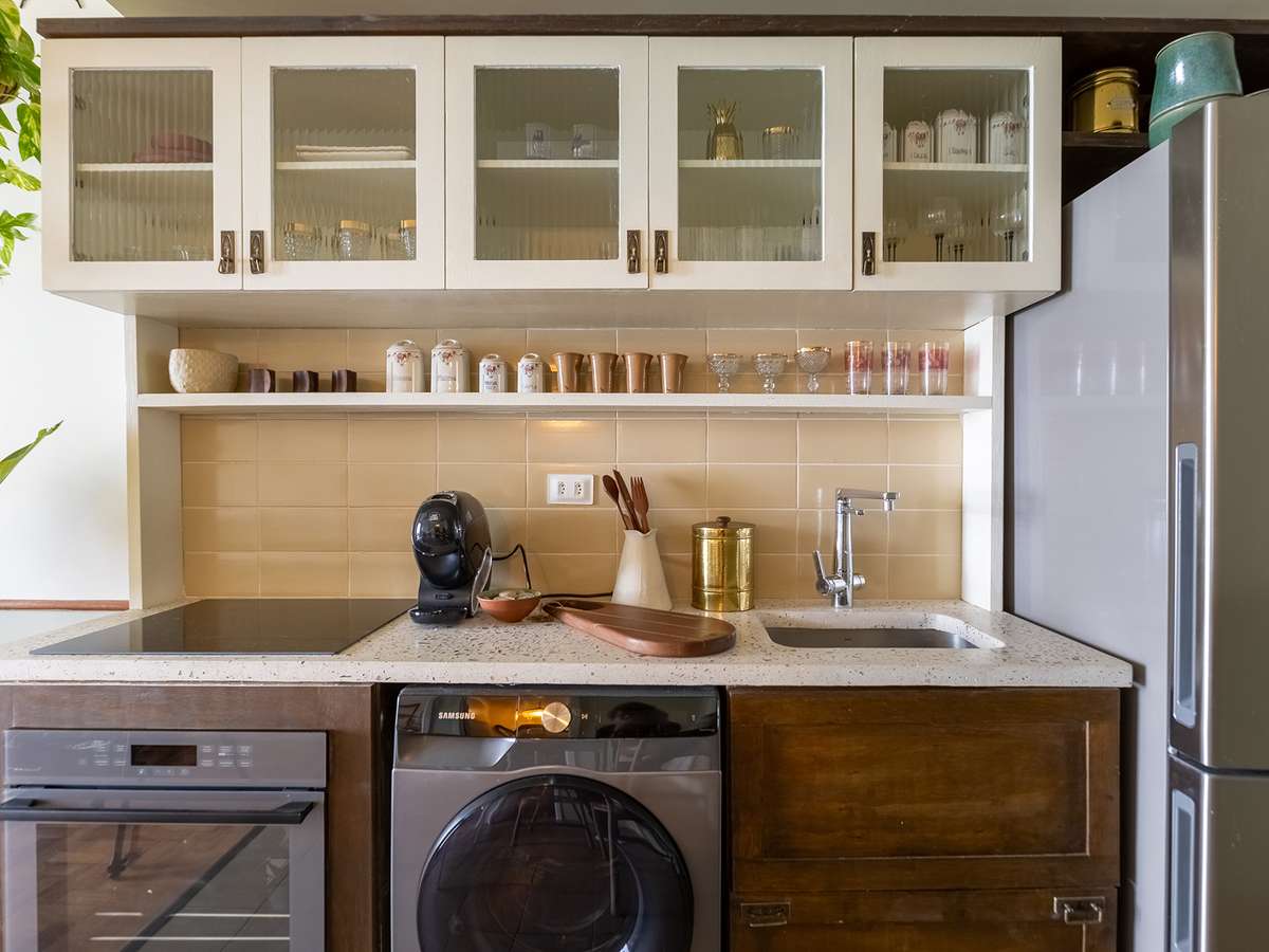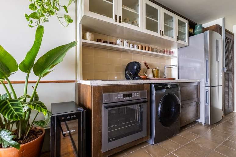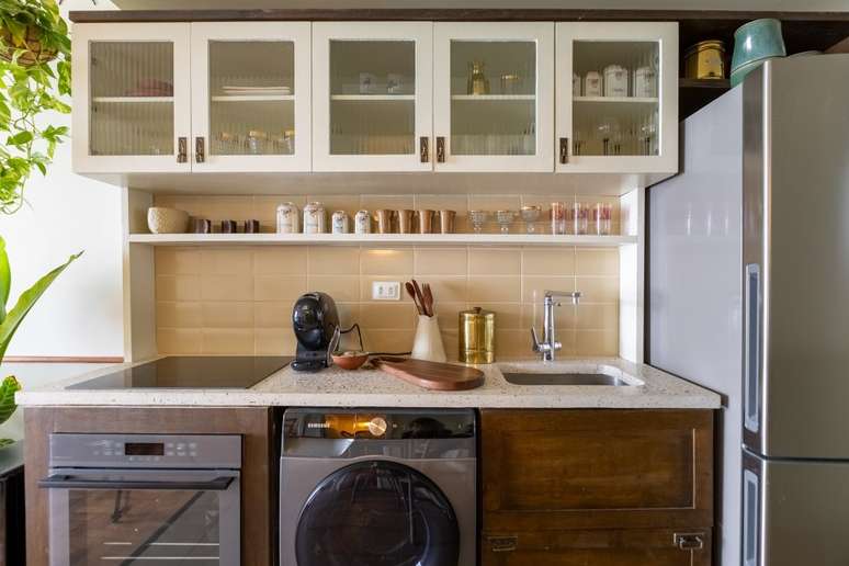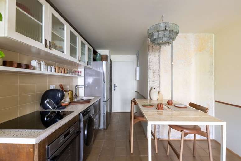 Logo na entrada, a pequena cozinha possui bancada de granilite feito com resíduos da própria obra do edifício - é possível ver pedacinhos de vidro no tampo, que abriga cooktop de indução e torneira com filtro embutido. O armário aéreo também reutiliza madeira e vidros originais do prédio e o toque despojado fica por conta dos puxadores feitos de antigas fechaduras de porta.