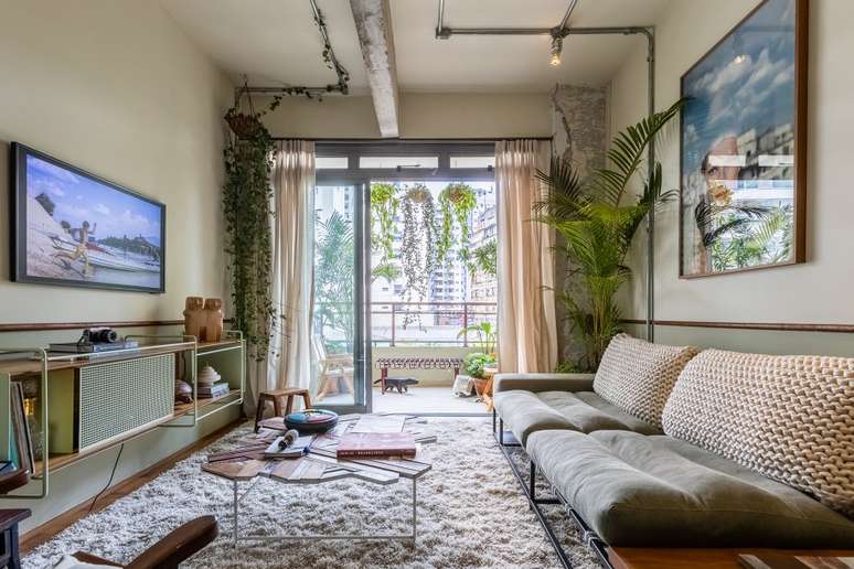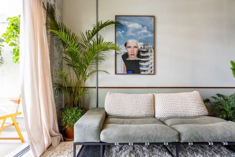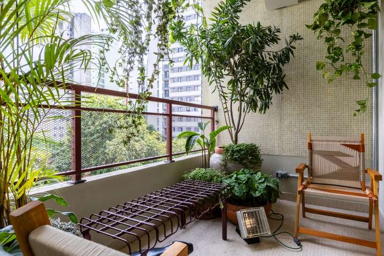 Para não alterar a fachada - cujo projeto arquitetônico tem assinatura do escritório Metrópole Arq - a varanda é compartilhada pelo living e pela suíte e recebeu plantas e móveis para áreas externas, além de piso e paredes revestidos com pastilhas restauradas. Para amenizar o barulho da rua, os caixilhos de alumínio possuem alto desempenho acústico. O paisagismo é de Carla Oldemburg.