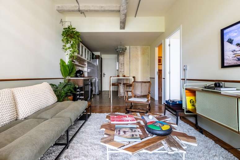 Nesta unidade, a sala integrada com a cozinha foi instalada onde originalmente havia dois apartamentos. Tanto que é possível ver as vigas no teto e também os complementos no piso de taco restaurado. Os conduítes aparentes evitam o quebra-quebra e dão um ar meio industrial ao projeto.
