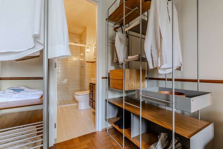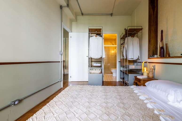 No quarto, o closet com armários abertos aumenta a sensação de amplitude e o nicho sobre a cama ganha ares de janela com a moldura de madeira.