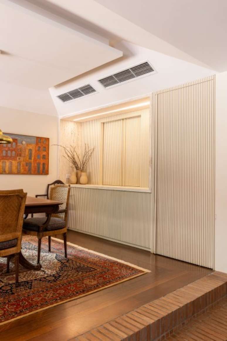 "Na sala de jantar mantivemos o forro trapezoidal original, fizemos um forro rebaixado de gesso e colocamos novos pendentes de latão sólido. Também quebramos a parede da antiga copa e criamos um painel de drywall, marcenaria e mármore para funcionar como passa pratos", explica a arquiteta.