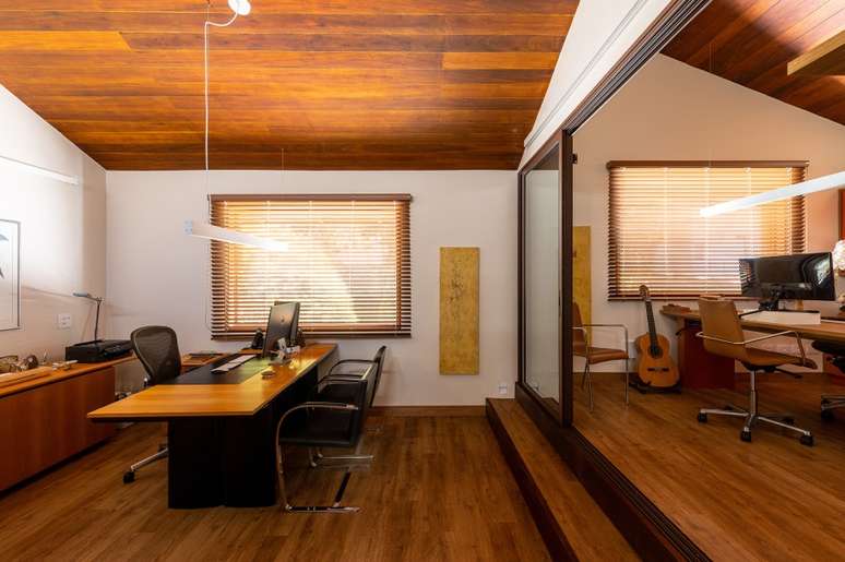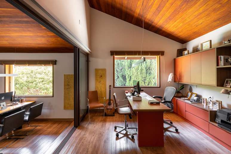 Os escritórios ficam em frente às escadas e ambos foram feitos com marcenaria amadeirada e toques de laranja terracota. Entre as duas salas, há uma área com equipamentos de ginástica e TV.