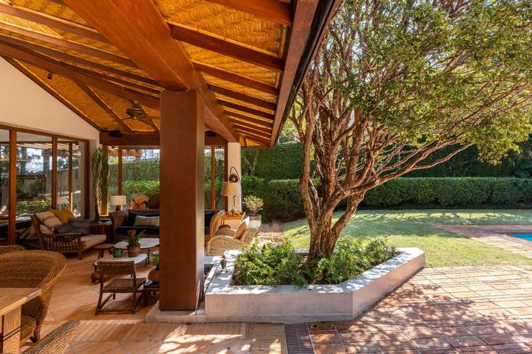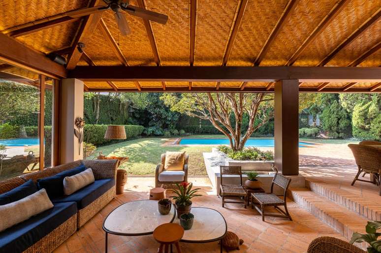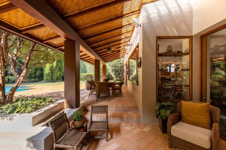 A ampla varanda sofreu diversas modificações: o projeto antigo deixava as salas frias e com pouca luz natural devido ao inclinamento do telhado. " Desmontamos a cobertura original que tinha 45% e realinhamos o vigamento em 30%. E o pé-direito no beiral que era de 1,80 m foi para 2 m", conta o escritório. Algumas telhas de vidro com ripado de bambu auxiliam na iluminação e o resto da estrutura recebeu forro de palha tramada.