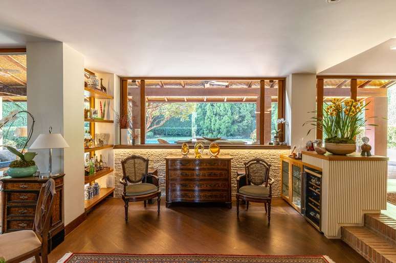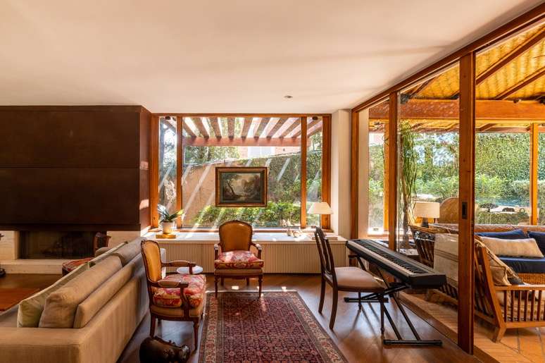 Em uma das laterais, um estar menor mais íntimo com poltronas e espaço para o teclado se aproveita da vista para o jardim - aqui, a área externa pode se integrar ao living somente abrindo a porta de vidro.