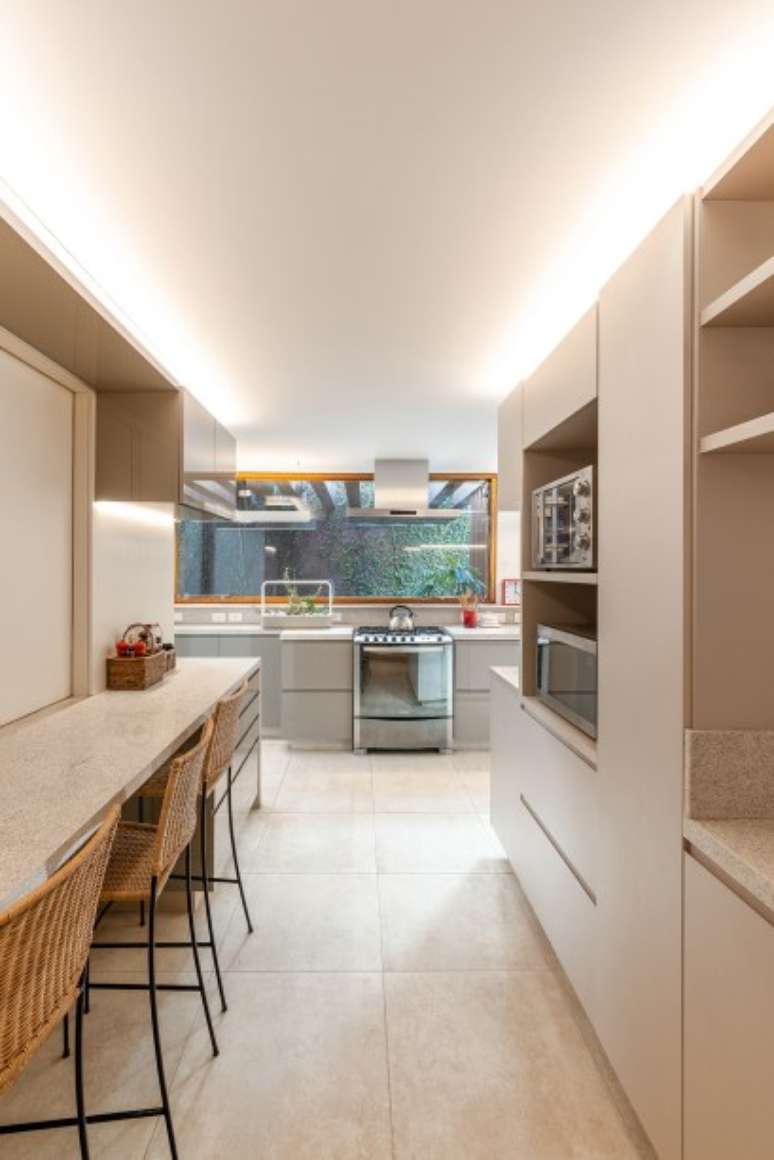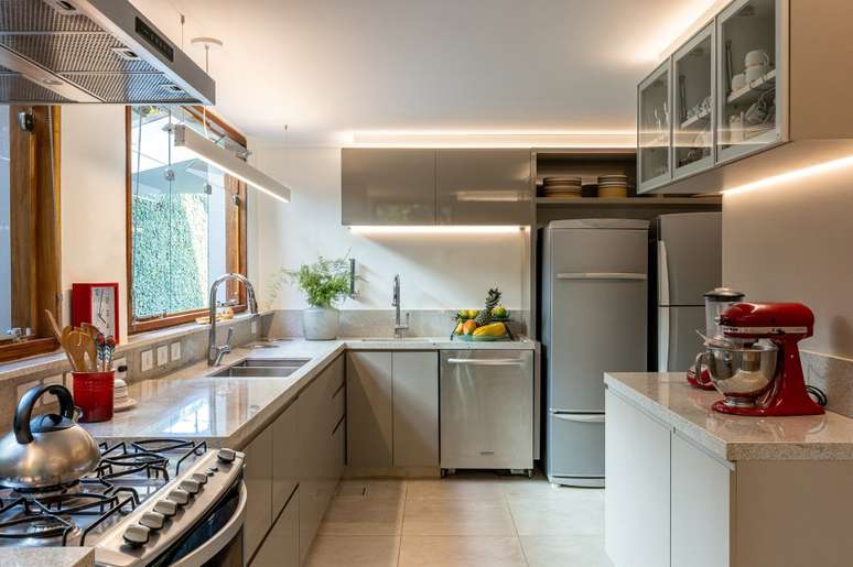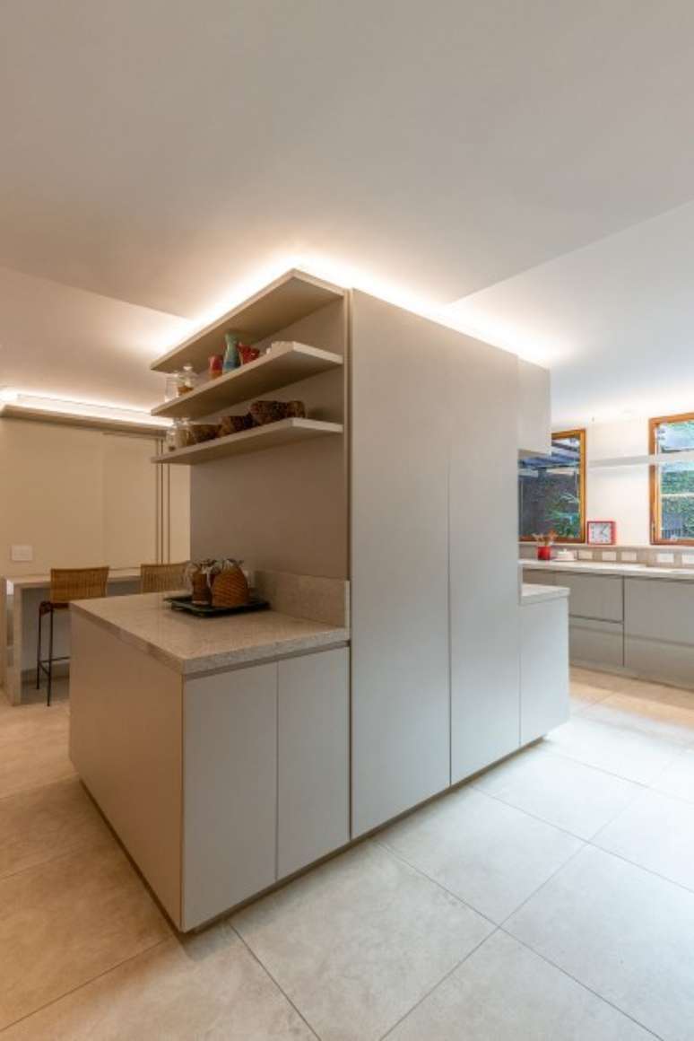 A ilha central com armários altos oculta um pilar. "Como o pé-direito da cozinha é baixo, com 2,3 m, e é laje, decidi fazer todos os rodatetos iluminados e embutir led na parte debaixo dos armários suspensos", explica a arquiteta.