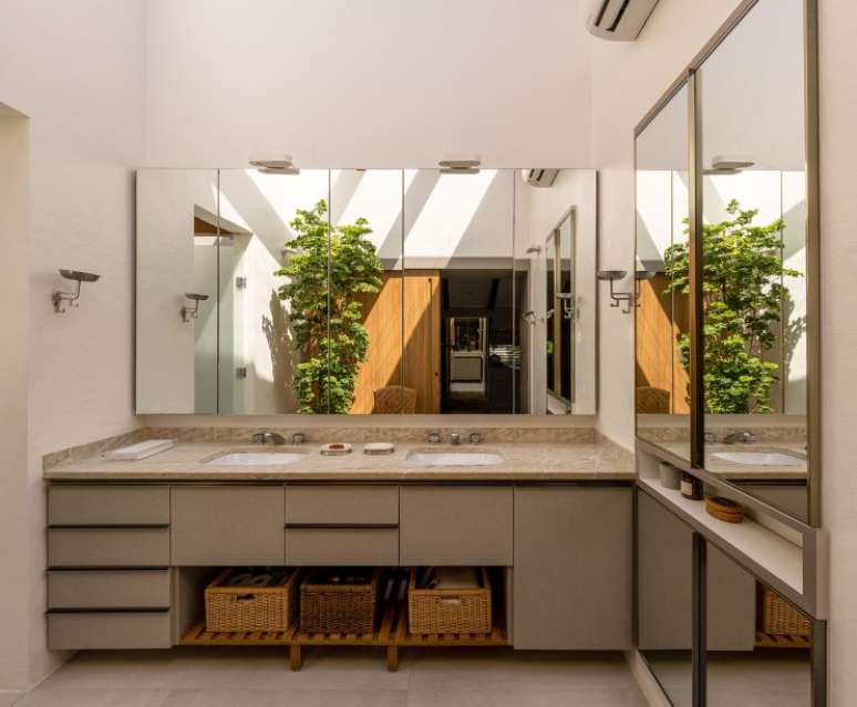 O banheiro da suíte tem iluminação zenital. "Essa proposta é original da casa e mantivemos, que é uma delícia! Trocamos os acabamentos para ficar dentro da paleta de cores e texturas do projeto", diz Marina.