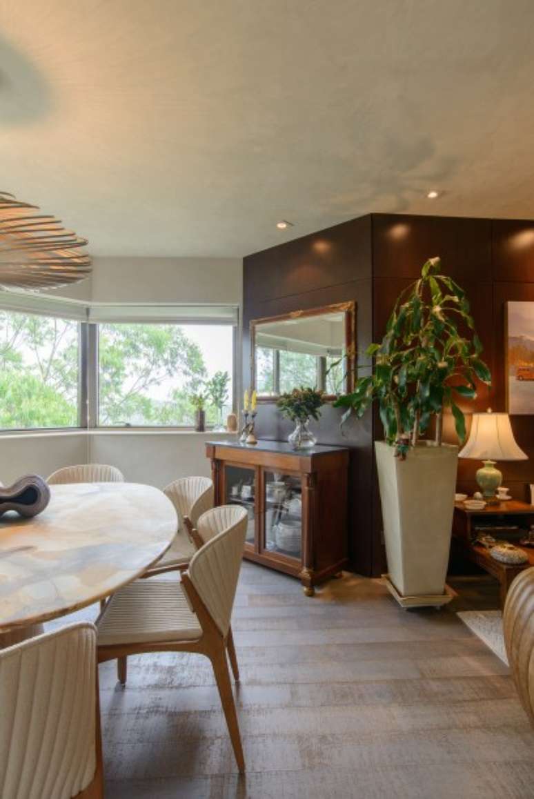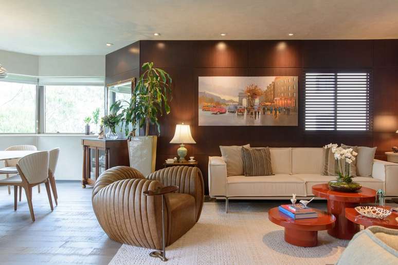 Toda a concepção do projeto de reforma teve como ponto de partida o painel de madeira escuro, atendendo a outro desejo dos moradores. Revestindo praticamente todas as paredes da área social, esse elemento garantiu mais personalidade ao ambiente.