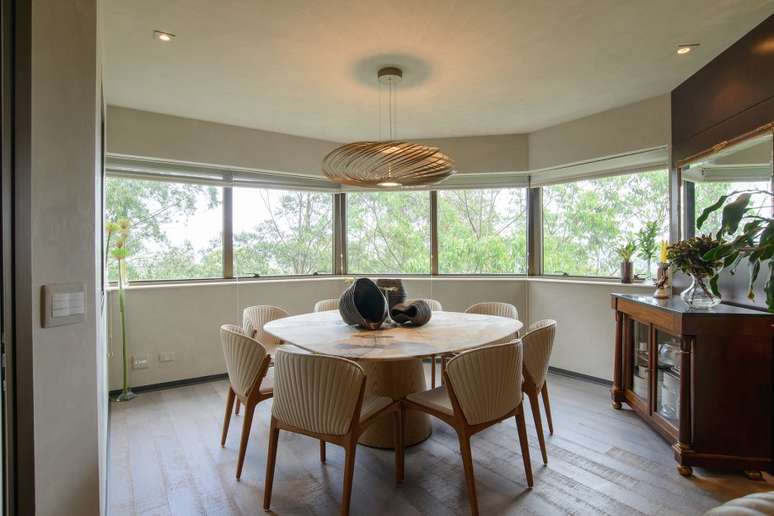 Com living, home theater e sala de jantar integrados, após a reforma, o apartamento se tornou mais versátil. A conexão entre esses ambientes foi possível graças à remoção das paredes que anteriormente separavam os cômodos.