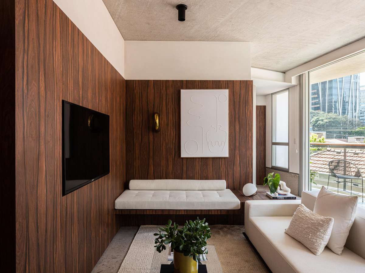 Painéis em madeira pau ferro contrastam com laje de concreto neste apê