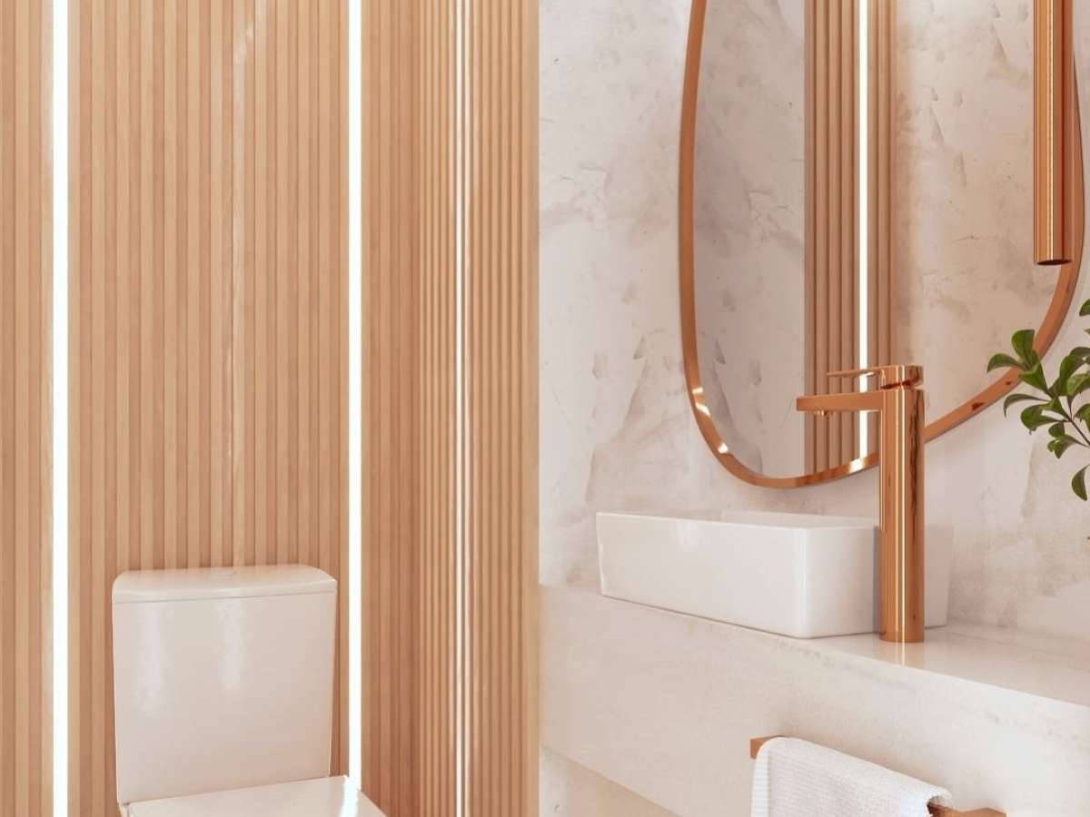 Aline garante que o ripado vai bem em qualquer cômodo, inclusive no banheiro. "O ripado no banheiro oferece aquele quê de spa ao cômodo, trazendo acolhimento e naturalidade. Por ser um local mais úmido, é preciso um pouco mais de atenção na escolha do material a ser utilizado. Existem porcelanatos e cerâmicas que se assemelham ao ripado, o que é vantajoso para o banheiro, já que pode molhar sem medo", esclarece a arquiteta.