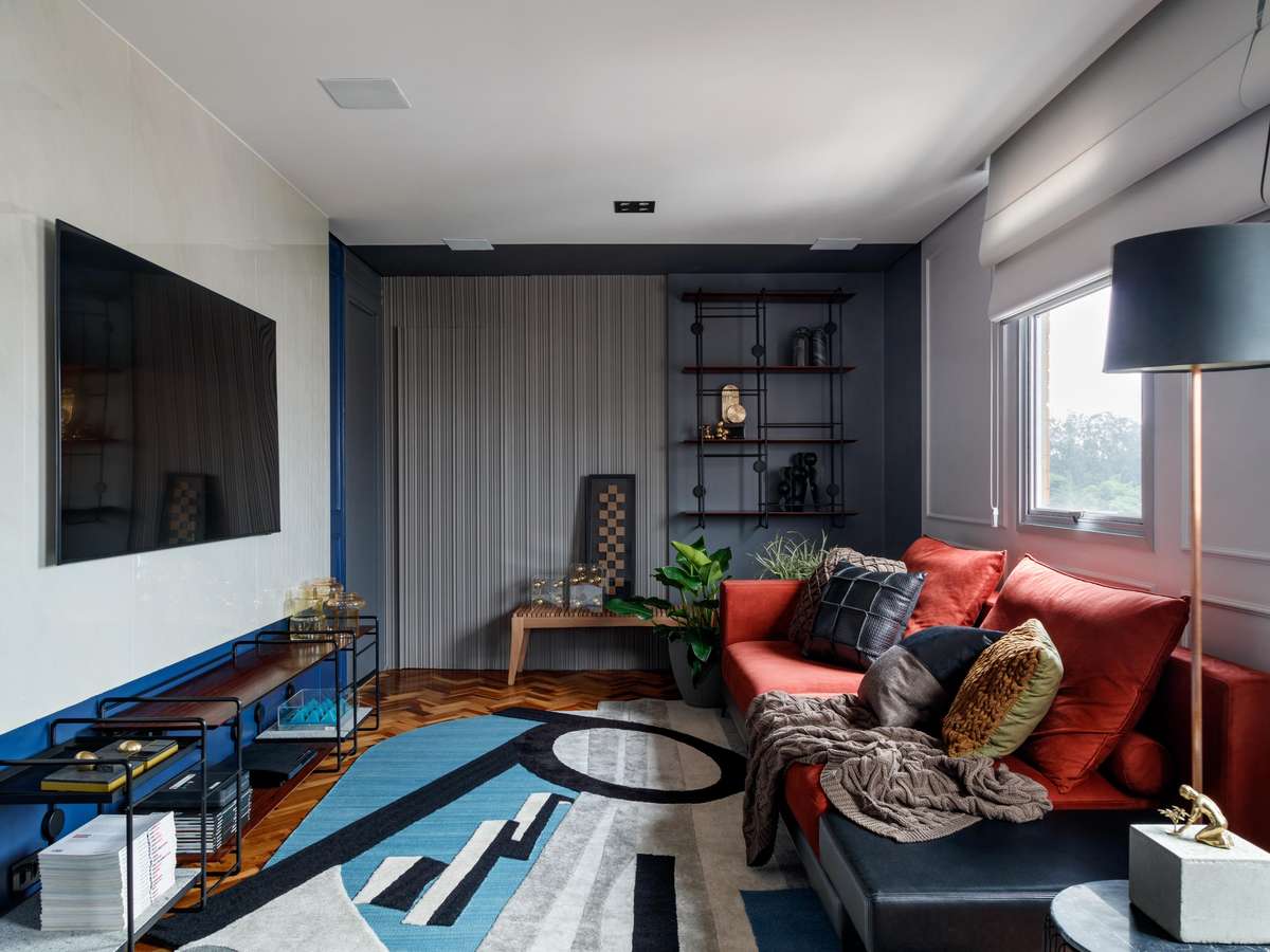 Neste projeto assinado por Ricardo Abreu Arquitetos, o painel de TV é revestido de porcelanato marmorizado, criando contraste com a parede azul com boiserie.