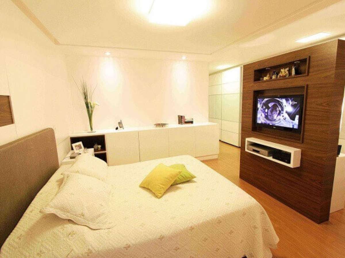 14- Projeto de para quarto pequeno tem painel de tv na parede oposta à cabeceira da cama. Fonte: Ana Mikulski