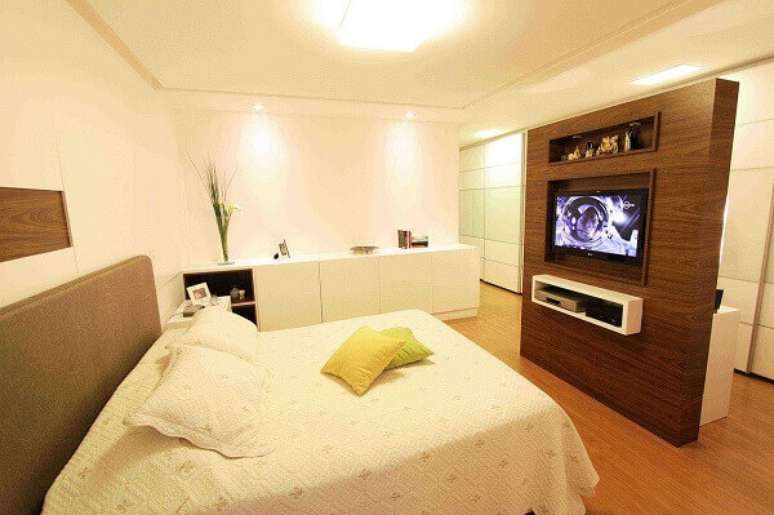 13- O painel para quarto com tv serve de divisória no dormitório. Fonte: Iara Kilaris