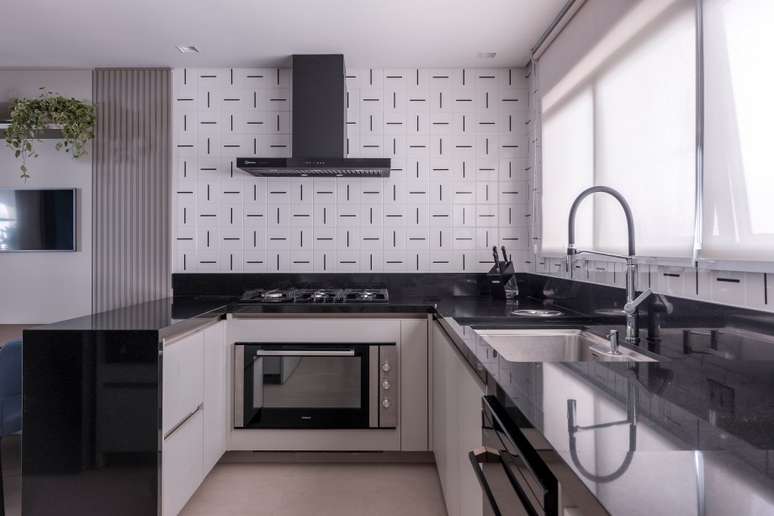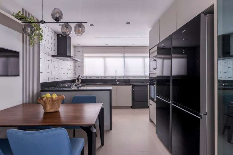 Separada da área social, a cozinha, com direito a uma pequena copa para as refeições diárias dos moradores, deu abertura para uma combinação clássica e atemporal: o mix entre o preto e cinza. Para acompanhar a marcenaria cinza clara o preto marcou presença no granito preto absoluto revestindo todas as bancadas, e nos eletrodomésticos.