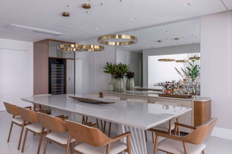 A arquiteta Marta Martins assina este apartamento de 240m², cujo grande destaque é o pé-direito duplo na sala de TV e varanda. Ali, o ripado de madeira foi considerado apenas de um lado para acompanhar a prateleira superior, trazendo um elemento inesperado e sofisticado.