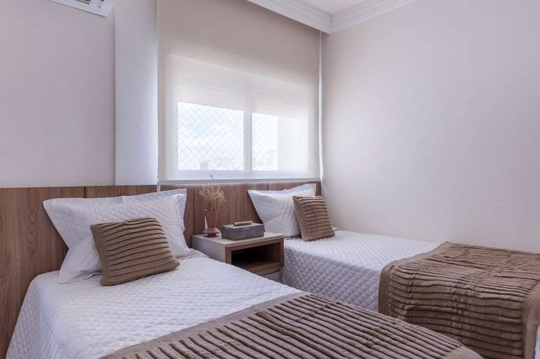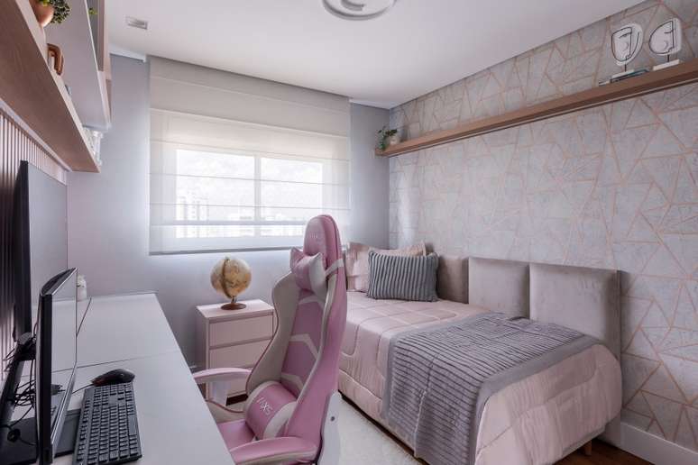 Para os quartos dos filhos, a arquiteta dedicou um olhar prático e otimizado que realça um décor funcional, mas que ainda assim exalam a individualidade de cada um dentro de uma leitura contemporânea. Pensando nas soluções de arquitetura de interiores, prateleiras e nichos, na parte superior das paredes do dormitório da menina, ajudaram na missão de aumentar o espaço de armazenamento, sem interferir na leveza visual.