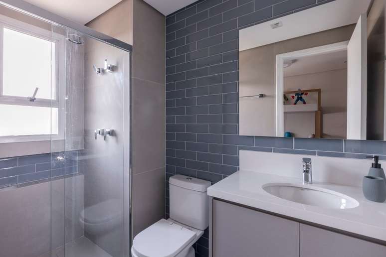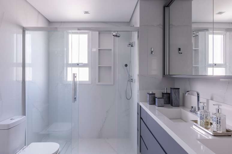 Dando continuidade ao que é encontrado nos quartos, os banheiros foram pensados realmente como um complemento aos espaços, recebendo elementos que transmitiram toda a particularidade de cada personalidade em uma área ainda mais íntima e que também precisa de conforto, como na suíte do casal com a pia dupla em quartzo branco, uma escolha harmoniosa com o porcelanato cinza ao estilo carrara.