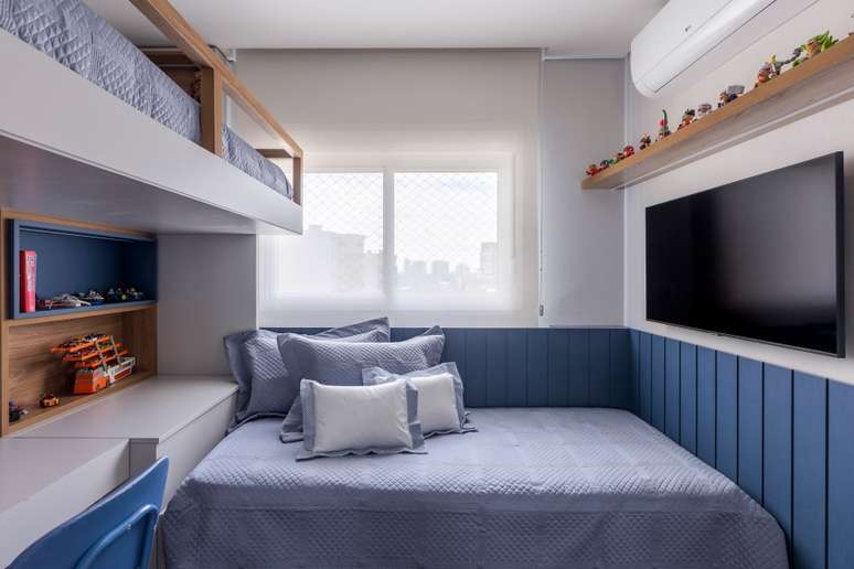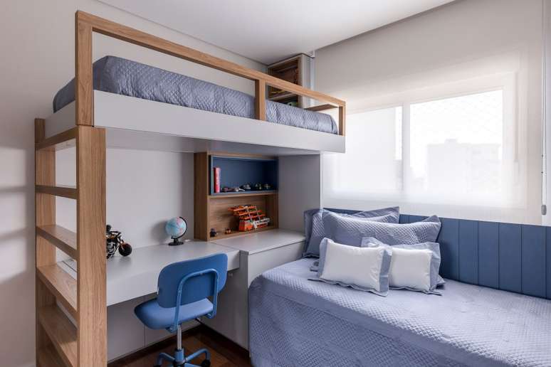 Já no quarto do menino, a marcenaria engloba uma cama auxiliar suspensa - pensada para receber os amigos -, e que na parte superior entregou uma confortável escrivaninha para os momentos de estudo. Com a cama encaixada no 'L' formado na parede, destaque para o lambri azul de madeira incluído nessa área.