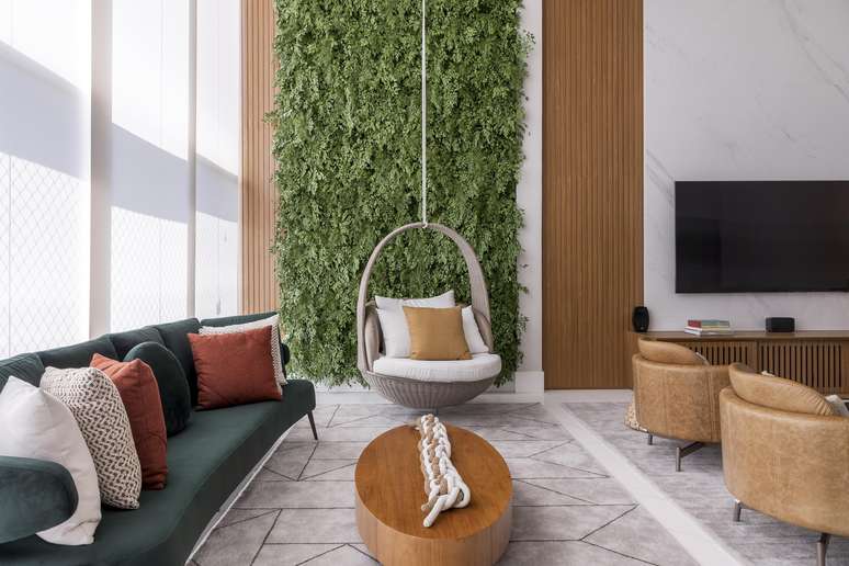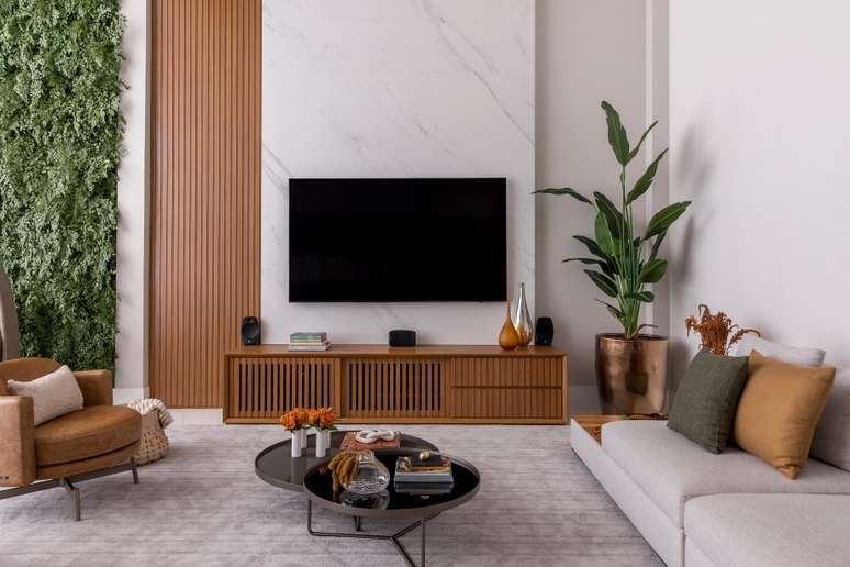 Painel ripado e marmorizado em pé-direito duplo é destaque em apê de 240m²
